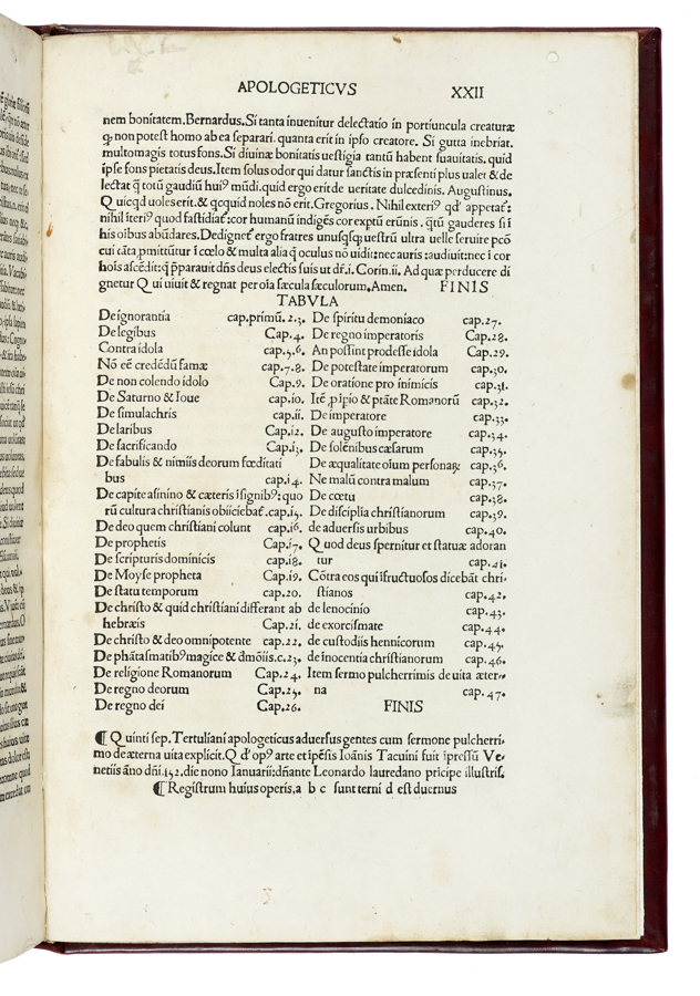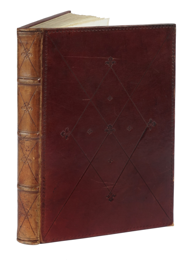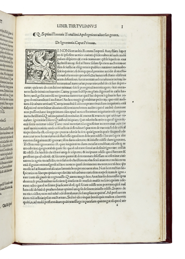 Lactantius Lucius Caecilius Firmianus, Opera perquam accurate castigata... (Al colophon:) Impressum Venetiis: arte et impensis Ioannis Tacuini, 152 [i.e. 1502] die iii e nono Ianuarii. 2 parti in 1 volume in-folio (mm 314x210). Carte VIII, CLX, XXII. Marca tipografica in legno al frontespizio; capilettera xilografici. Carta A1 con testatina e capolettera in rosso. Primo colophon, che reca la data: 1502 die iii Ianuarii, alla carta V8v; l'altro alla carta d4v. Una gora marginale alla carta π1 e c5; macchioline, rari fori di tarlo (alcuni restaurati) che non coinvolgono il testo e lievi fioriture sparse. Nel complesso buona conservazione. Legatura d'amatore in pieno vitello, con fregi impressi a secco ai piatti e al dorso a 3 nervi. iscrizione Fr. Jo. Baptista Melonarius in calce al frontespizio; ex-libris in carta (MB) sciolto. (1)Il curatore, Pierio Valeriano, nipote del monaco Urbano Bolzanio, lavorò anche come correttore per Aldo Manuzio. EDIT 16 34364.
