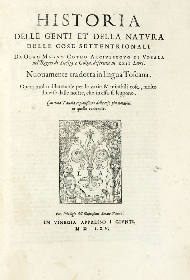 Magnus Olaus, Historia delle genti et della natura delle cose settentrionali… (Al colophon:) In Venetia: nella stamperia di Domenico Nicolini alle spese degli heredi di Luc'antonio Giunti, 1565.