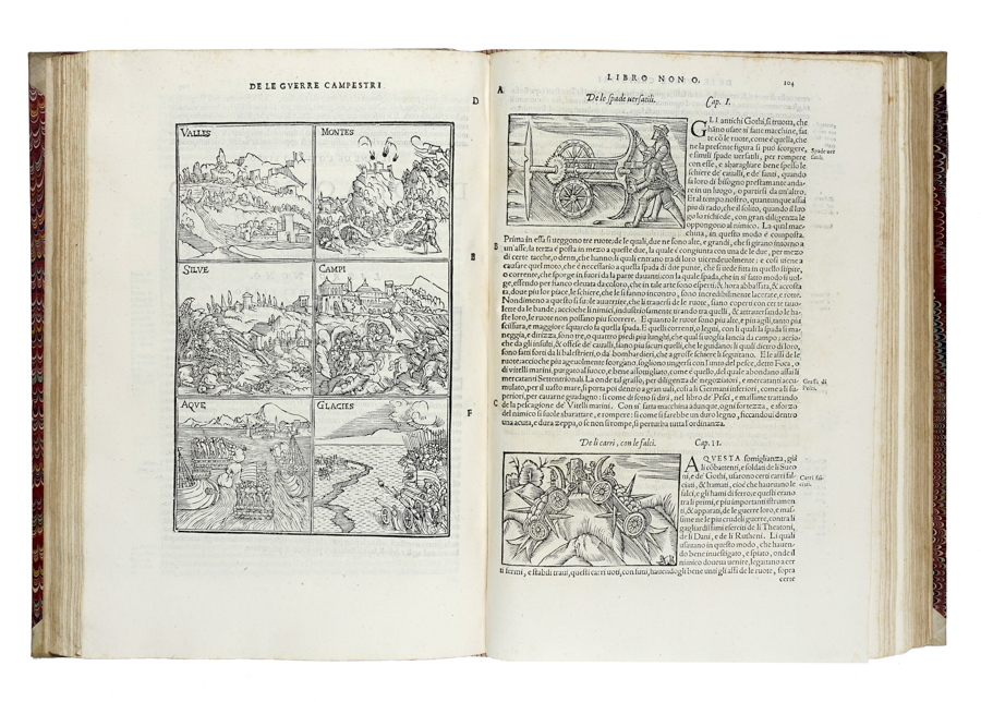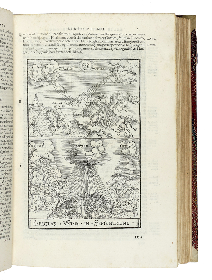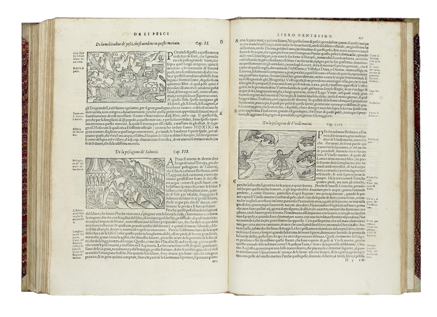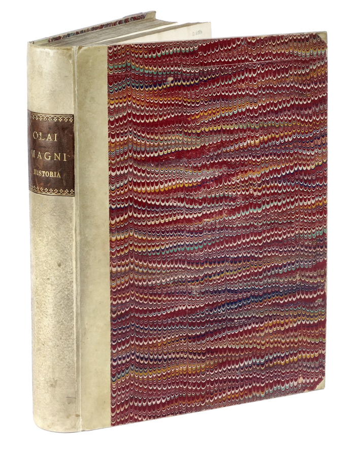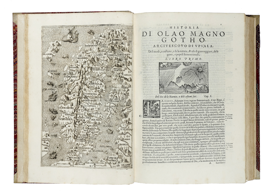 Magnus Olaus, Historia delle genti et della natura delle cose settentrionali [...]descritta in XXII libri. Nuovamente tradotta in lingua Toscana. [...]. Con una tavola copiosissima delle cose piu notabili, in quella contenute. In Vinegia: appresso i Giunti, 1565. (Al colophon:) In Venetia: nella stamperia di Domenico Nicolini alle spese degli heredi di Luc'antonio Giunti, 1565. In-folio (mm 320x215). Pagine [26], 286. Marca xilografica al frontespizio e al verso dell'ultima carta; capilettera in legno. Una carta calcografica della Scandinavia al verso della carta c6 e moltissime vignette xilografate nel testo. Bruniture concentrate in alcune carte, occasionali fioriture e una piccola mancanza che coinvolge l'inciso alla carta R2. Nel complesso ottimo esemplare. Legatura moderna in mezza pergamena, con piatti marmorizzati e titoli su tassello al dorso. (1)Seconda traduzione italiana dell'opera di Magnus sulla Scandinavia, importantissimo testo di riferimento relativo alla storia naturale, alla cultura, ai costumi e alle pratiche militari scandinave nella seconda metà del Cinquecento, dopo l'edizione veneziana di Francesco Bindoni del 1561 nella versione di Remigio Fiorentino, che però non era illustrata. Qui lo splendido e ricco apparato iconografico è tratto dalla prima edizione italiana in latino, pubblicata a Roma nel 1555, con la differenza che nella presente edizione la mappa è incisa su rame anziché su legno. EDIT 16 27290; cfr. Mortimer, Harvard Italian 270 (per l'edizione del 1555).