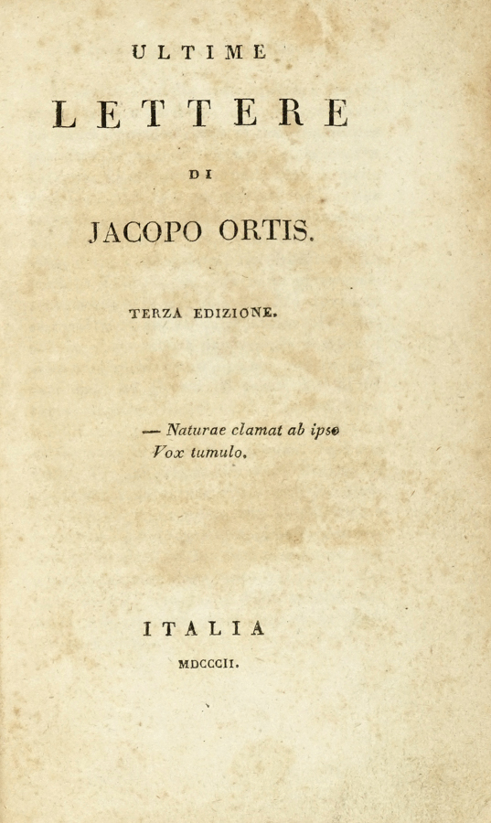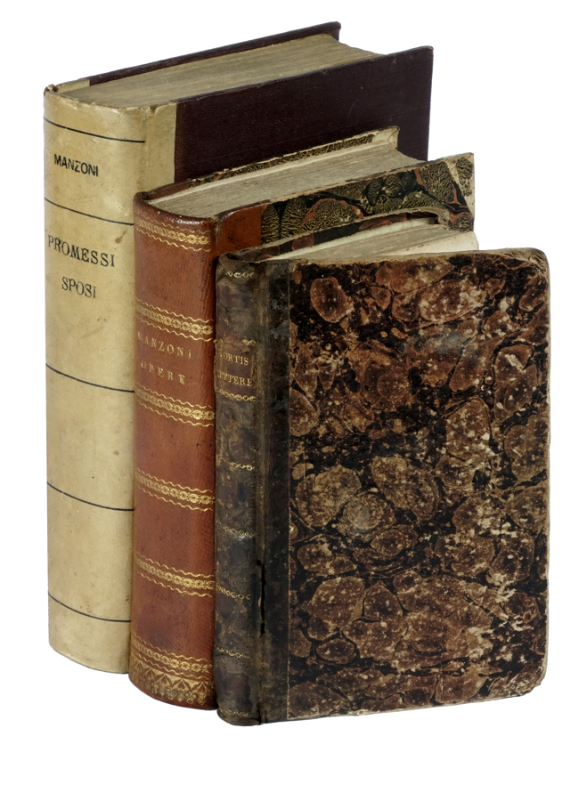 Manzoni Alessandro, I Promessi Sposi con illustrazioni tratte dalla storia lombarda di Cesare Cantù. Firenze: David Passigli e soci, 1836. In-8° (mm 190x125). Con illustrazioni a piena pagina fuori testo. Legatura coeva in mezza pelle con piatti in carta marmorizzata e titoli in oro al dorso. SI AGGIUNGE: Id., I Promessi Sposi [...] nelle due edizioni del 1840 e 1825 raffrontate tra loro dal prof. Riccardo Folli. Milano: Domenico Briola, 1896. 1 volume in-4° (mm 220x140). SI AGGIUNGE: Foscolo Ugo, Ultime lettere di Jacopo Ortis. Terza edizione. Italia: s.e., 1802. 1 volume in-8° (mm 170x102). (3)