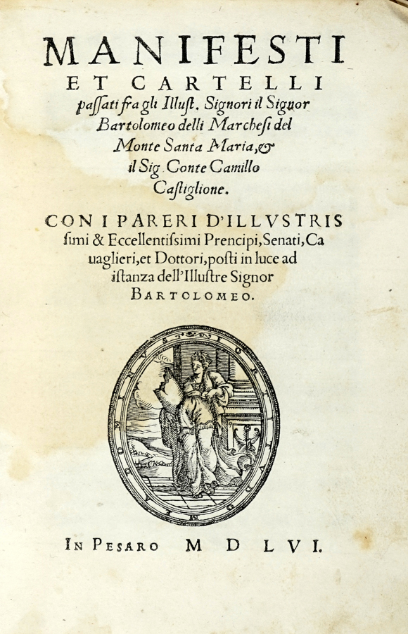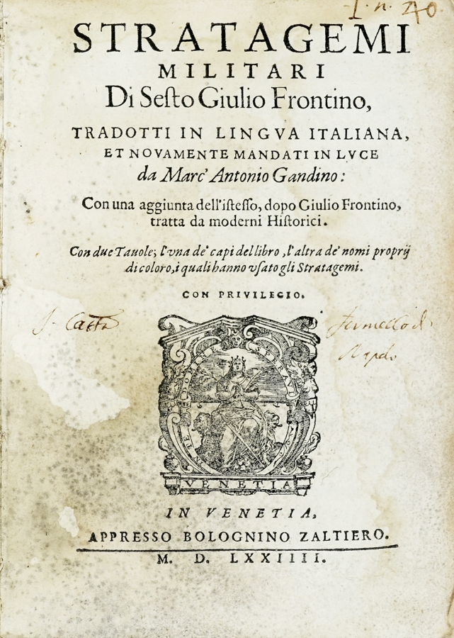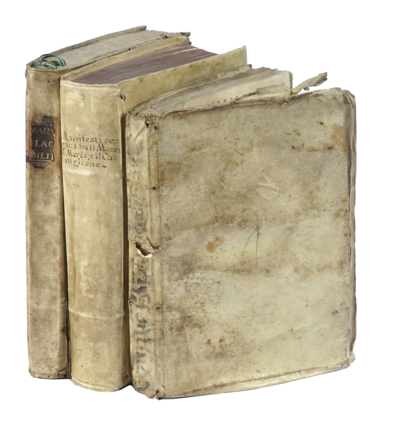 Martena Giovanni Battista, Flagello militare diviso in quattro parti... In Napoli: per Novello de Bonis stampator arcivescovale, 1676. In-4° (mm 207x160). Pagine [12], 211, [1]. Mancanti le carte P3 e P4. Con 18 (di 20) tavole calcografiche fuori testo, di cui il ritratto dell'Autore e un bel frontespizio in rame che segue quello tipografico. Testatine, capilettera e finalini nel testo. Carte uniformemente brunite con fioriture sparse e gore d'acqua e tracce di umidità concentrate agli ultimi fascicoli. Legatura in piena pergamena rigida con titoli in oro su tassello in pelle al dorso. Forellini di tarlo a piatti e contropiatti, mancanze e taglietti alle unghiature e alla cerniera anteriore. Stemma araldico in rame incollato al contropiatto anteriore. SI AGGIUNGE: Frontinus Sextus Iulius, Stratagemi militari... In Venetia: appresso Bolognino Zaltiero, 1574. In-4° (mm 195x142). Carte [4], 125. Esemplare interamente gorato con tracce di umidità e foxing alle carte. Alcune postille ai margini del testo. Legatura in piena pergamena molle con titoli manoscritti al dorso, quasi interamente staccata. Note di mano antica al frontespizio e alla sguardia anteriore. SI AGGIUNGE: Castiglioni Camillo, Manifesti et cartelli passati fra gli illust. Signori... In Pesaro: [Bartolomeo Cesano], 1556. In-4° (mm 200x134). Carte [4], 229, [1]. Assenti 25 carte (I4-O4). Testatine, capilettera istoriati e finalini in legno. Esemplare gorato con carte uniformemente brunite e sporadiche tracce di foxing. Legatura in piena pergamena rigida con titoli manoscritti al dorso. Tagli rossi. Nota manoscritta e timbro di precedente collezione al foglio di guardia.