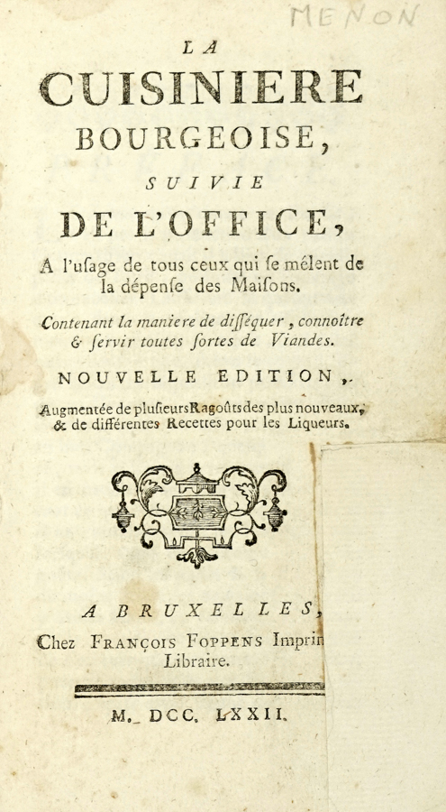 Menon Joseph, La Cuisinière Bourgeoise. A Bruxelles: chez François Froppens, 1772.