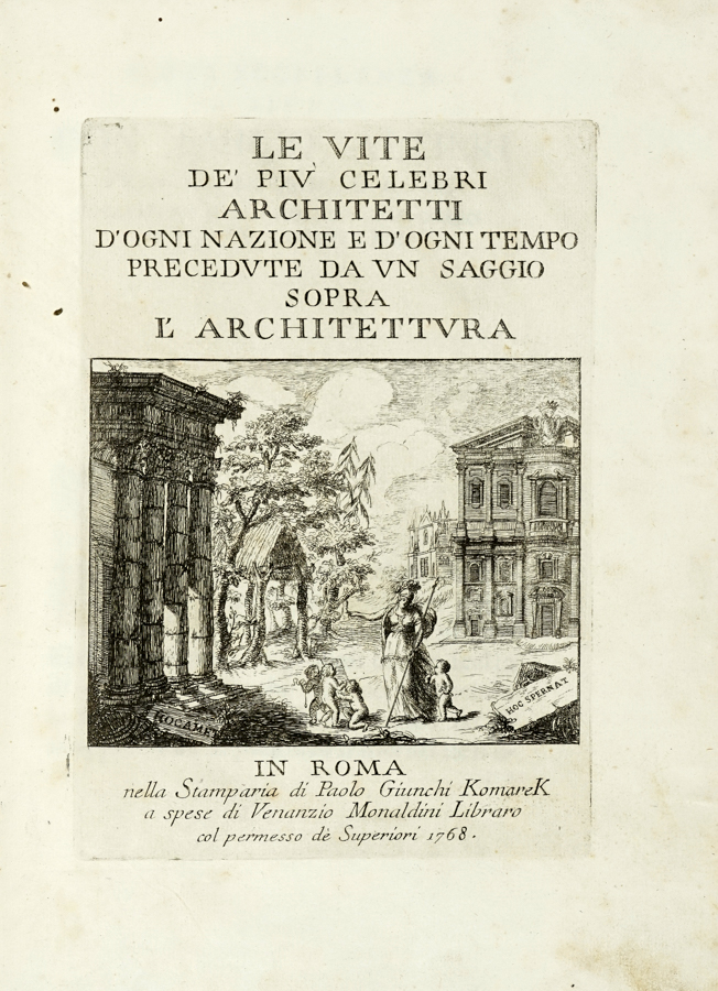 Milizia Francesco, Le Vite de' piú celebri architetti d'ogni nazione e d'ogni tempo precedute da un saggio sopra l'architettura. In Roma: nella stamparia di Paolo Giunchi Komarek, 1768.