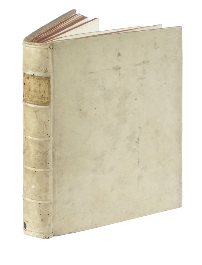 Milizia Francesco, Le Vite de' piú celebri architetti d'ogni nazione e d'ogni tempo precedute da un saggio sopra l'architettura. In Roma: nella stamparia di Paolo Giunchi Komarek, 1768. In-4° (mm 285x205). Pagine [2], VIII, 492. Con 6 tavole ripiegate fuori testo, rilegate in fine. Bella vignetta al frontespizio inciso in rame, testatine e capilettera xilografici. Forellini di tarlo marginali che non coinvolgono il testo e fioriture sparse, concentrate principalmente nell'ultima parte del volume. Legatura coeva in piena pergamena, con titoli su falso tassello dorato al dorso a 5 nervetti, tagli rossi e contropiatti in carta marmorizzata. Internamente un po' allentata nella parte anteriore, con alcuni forellini di tarlo al dorso e tracce di polvere ai piatti, ma nel complesso buono stato di conservazione. (1)Prima edizione di questo manifesto dell'estetica neoclassica (la cui importanza per la storiografia dell'architettura eguaglia quella del Vasari per gli artisti del Rinascimento) in cui il Milizia, contestatore del manierismo e del barocco, propone un ritorno all'ideale estetico della bellezza greca classica. Dopo le indagini storiche dei monumenti antichi e medievali e dei programmi edilizi tradizionalmente associati ai grandi sovrani, l'Autore ripercorre le vite e le opere dei principali architetti europei dal XV secolo, fornendo brevi riassunti delle loro vite e delle loro opere principali. La sua inclinazione razionalista e neoclassica nel valutare le loro produzioni si pensa derivi dal teorico veneziano Carlo Lodoli. Il suo interesse per l'architettura oltre i confini dell'Italia è altamente insolito. Melzi III 257; Cfr. Cicognara 2324