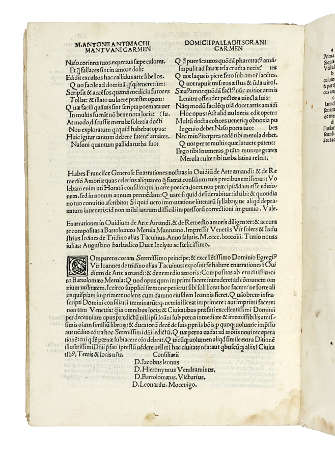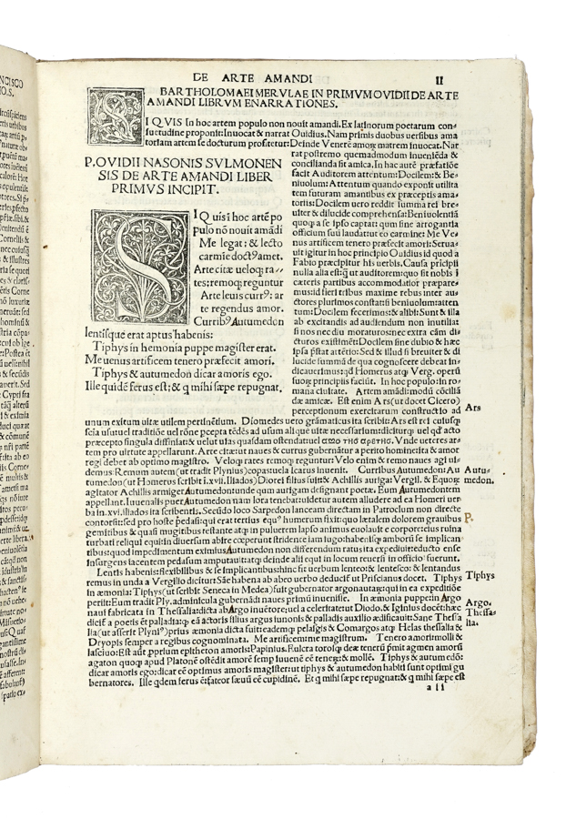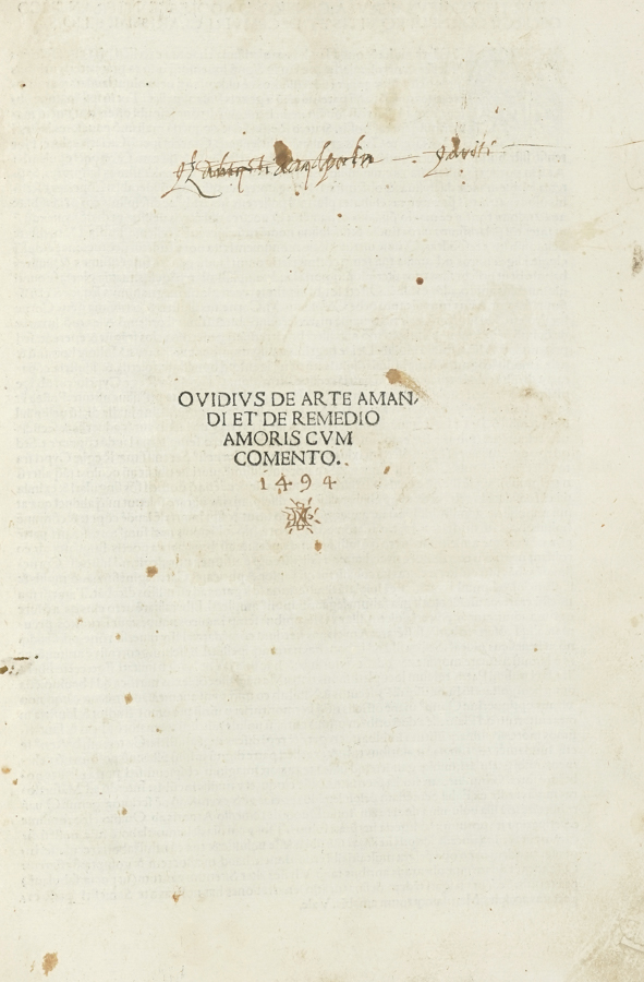 Ovidius Naso Publius, De arte amandi et de remedio amoris cum comento. (Al colophon:) Impressit Venetiis: Ioannes de Tridino alias Tacuino, 5 luglio 1494.