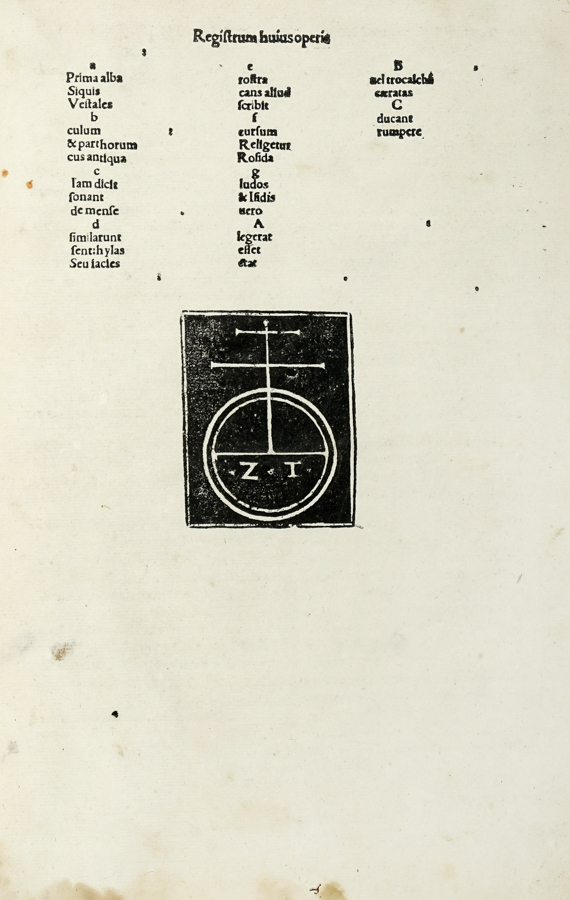 Ovidius Naso Publius, De arte amandi et de remedio amoris cum comento. (Al colophon:) Impressit Venetiis: Ioannes de Tridino alias Tacuino, 5 luglio 1494. In folio (mm 290x200). Carte LIII, [1]. Collazione: a-g6 A6 B-C4. Iniziali xilografiche, marca tipografica in fine. Copia con piccoli e marginali lavori di tarlo che non ledono il testo e una leggera gora d'acqua nel margine inferiore delle carte, più visibile in alcune carte di volume. Macchia alle carte g5, g6 e al fascicolo A. Legatura in piena pergamena floscia con titolo manoscritto al dorso. Mancanza in corrispondenza della cuffia inferiore. Nota manoscritta alla prima carta. (1)Seconda edizione dell'Ars amandi e del De remedio amoris con il famoso commento di Bartolomeo Merula, a pochi mesi di distanza dalla prima pubblicata proprio dal Tacuino nel maggio 1494. I repertori citano tre versioni di questa edizione con identico colophon, una delle quali viene comunemente datata dopo il 1500. Cfr Goff O 144; GW M28642; Hain 12220; IGI 7057; ISTC io00145000. BMC V, 535 censisce l'edizione cinquecentesca: «the book belongs to one of three editions with this date (Hain 12220, 12221) and may be of the sixteenth century».