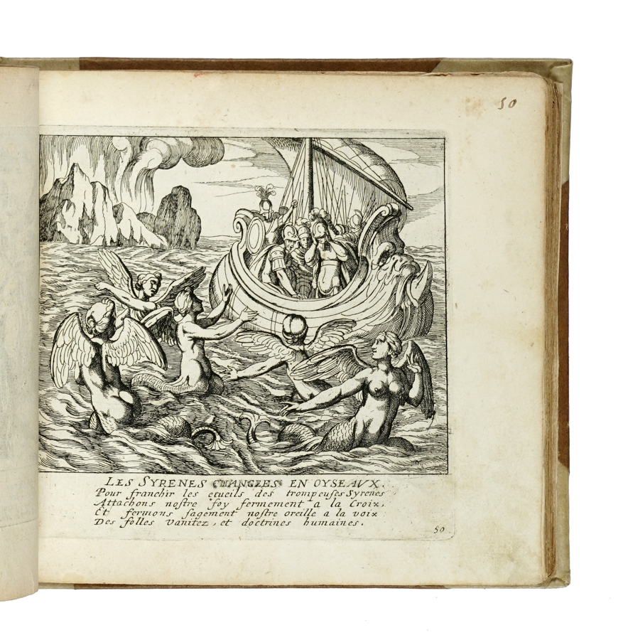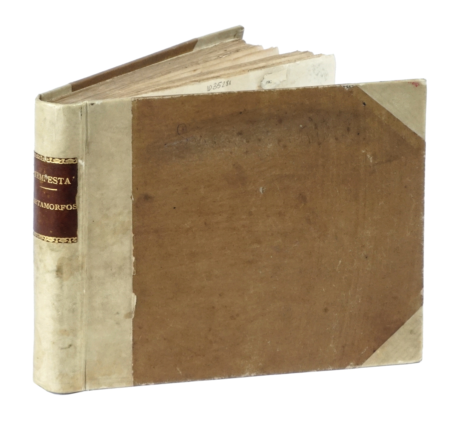 Ovidius Naso Publius, Metamorphoseon sive transformationum Ovidianarum libri... Paris: Balthazar Moncornet, s.d. [i.e. XVII secolo]. In-8° obllungo (mm 150x165). 1 frontespizio inciso e 141 (su 150) splendide tavole calcografiche di Antonio Tempesta, numerate, titolate e accompagnate da una quartina in francese in lastra. Rinforzi al margine interno delle prime e ultime carte, al margine inferiore del frontespizio e della tavola 1 (La creation du Monde). Uno strappo con perdita di inciso alle tavole 7 e 85, uno senza perdite di inciso alla 109 e uno strappo maldestramente restaurato con nastro adesivo alla 57. Forti bruniture e macchie. Legatura in mezza pergamena con punte e titoli in oro su tassello al dorso; sguardie rinnovate. Minimi difetti. (1)Brunet V, 695 e Cicognara 4749 per altra edizione.