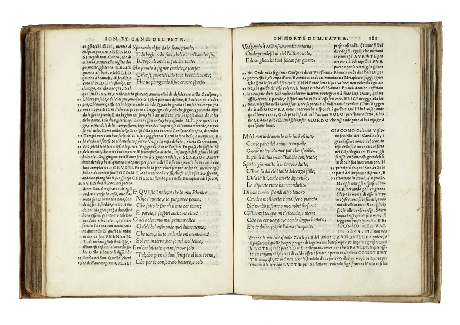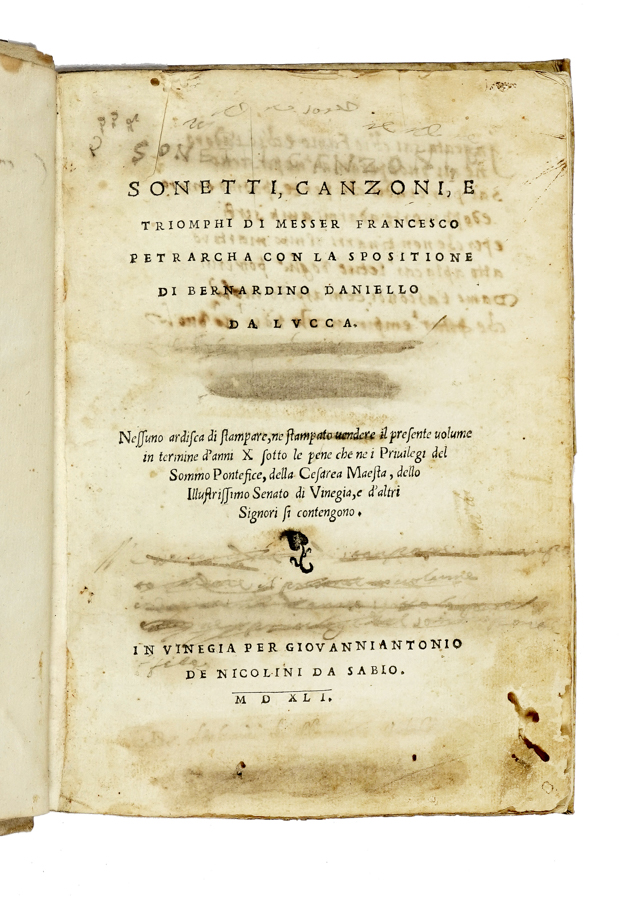 Petrarca Francesco, Sonetti, Canzoni, e Triomphi [...] con la spositione di Bernardino Daniello da Lucca. In Vinegia: per Giovanni Antonio de Nicolini da Sabio, 1541. (Al colophon:) In Vinegia: nelle case di Giovanniantonio de Nicolini da Sabio, 1541. Del mese di Marzo). In-4° (mm 212x146). Carte [6], 262 [i.e. 264]. Uno strappo, senza perdite, al frontespizio, con margine interno rinforzato; numerosi fori di tarlo sparsi e macchie, concentrate principalmente in alcune carte. Legatura successiva in piena pergamena rigida, con titoli su doppio tassello in pelle al dorso; tagli spruzzati. Macchie ai piatti. Annotazioni cassate al frontespizio; nota di possesso manoscritta e ex-libris cartaceo alle sguardie anteriori. Conservato sciolto, il frontespizio di un'edizione espurgata del Petrarca, Il Petrarca spirituale di Gerolamo Malipiero del 1536; contenente un ritratto xilografico del Petrarca al recto e una xilografia di Malipiero e Petrarca al verso. Carta leggermente brunita e macchiata e con fori di tarlo che coinvolgono l'inciso. (1)Edizione con il commento di Bernardino Daniello, allievo a Venezia di Trifone Gabriele, della scuola del Bembo. Nel gennaio del 1541 Giovanni Antonio Nicolini da Sabbio aveva già stampato un'edizione del Petrarca con il commento del Vellutello e altre quattro edizioni delle Rime furono pubblicate, nello stesso anno, da altri editori veneziani, segno dello straordinario interesse per l'opera del Poeta. EDIT 16 32064; Petrarchesca Rossettiana di Trieste 62; Adam P 806; Speck, Bibliotheca Petrarchesca 232-233.