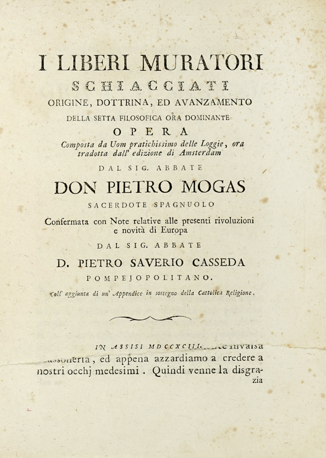 Pérau Gabriel-Louis-Calabre, I liberi muratori schiacciati. Origine, dottrina ed avanzamento della setta filosofica ora dominante. Opera composta da Uom pratichissimo delle loggie ora tradotta dall'edizione di Amsterdam dal sig. abbate don Pietro Mogas... In Assisi: [per Ottavio Sgariglia], 1793. In-4° (mm 265x190). Pagine XII [i.e. VIII], 272. Mancanti 2 carte del fascicolo π⁶ e la tavola calcografica fuori testo, raffigurante i simboli massonici in rapporto alla Loggia. Esemplare in barbe, con fioriture diffuse, bruniture e gore marginali ad alcune carte. Grave mancanza al margine inferiore del frontespizio, con perdita di inciso. Legatura coeva in cartonato muto, con ampia mancanza al dorso e al piatto posteriore. Esemplare da studio, non passibile di restituzione. (1)Lattanzi 836: «Quest'opera, col titolo presente, è rarissima: infatti fu soppressa nel Titolo, Prefazione ed Approvazione, e messa in commercio anonima col titolo I segreti del massonismo svelati al pubblico per bene e cautela dei cattolici (Italia, 1793 - Con lic. de' Superiori).». Si tratta della rarissima prima edizione della traduzione italiana dell'opera francese Les Francs-Maçons écrasés. Suite du livre L'ordre des Francs Maçons trahi, il cui autore è controverso: Caillet (il quale ritiene che questa interessante opera sia apologetica della massoneria) l'attribuisce a Pérau; Barbier avanza anche l'ipotesi di Giovanni Gualberto Bottarelli; Melzi II 126, invece, afferma che quest'opera «[...] che dicesi scritta in francese da Mr. Peton, fu tradotta in italiano dall'ex gesuita Pietro Mogas, ed illustrata con note ed appendice dall'abate Pietro Saverio Casseda.». Si veda Caillet 8510 per l'edizione francese.
