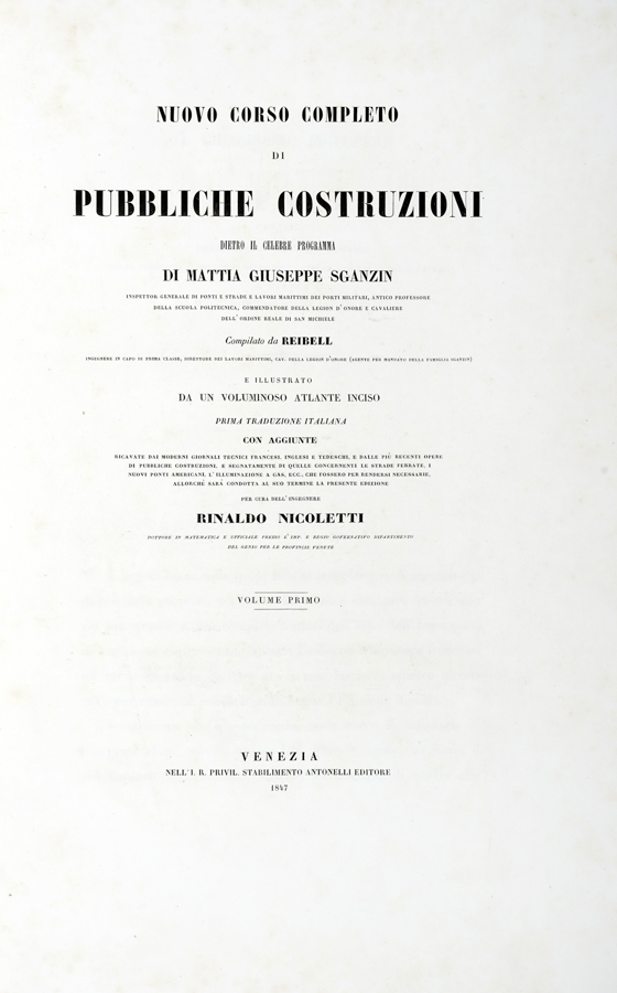 Reibell Felix Jean Baptiste Joseph, Nuovo corso completo di pubbliche costruzioni dietro il celebre programma di Mattia Giuseppe Sganzin [...] Volume primo (-terzo). Venezia: Antonelli, 1847-1853.