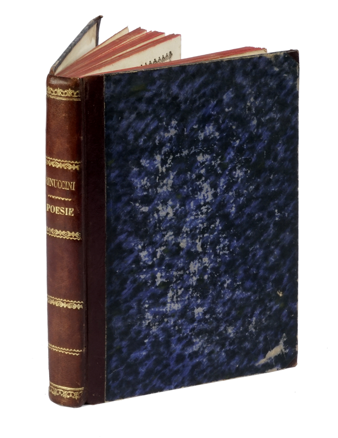 Rinuccini Ottavio, Poesie. In Firenze: Appresso i Giunti, 1622. In-4° piccolo (mm 216x145). Pagine [8], 294, 2 bianche. Marca dello stampatore al frontespizio, capilettera, finalini e cornice tipografica a tutte le pagine di testo, incluso il frontespizio, incisi in legno. Copia con lievi fioriture, più visibili in alcuni fascicoli di testo. Legatura ottocentesca in mezza pelle con punte e piatti in carta marmorizzata blu. Titolo e decorazioni in oro al dorso, tagli rossi. Nota di possesso manoscritta di mano antica al frontespizio. (1)Prima edizione collettiva edita postuma per le cure di Pier Francesco Rinuccini. Piantanida 2612: «Il vol. comprende l'Euridice ed una vasta raccolta di rime [...] e le famose canzonette per musica». Scritta dal Rinuccini e musicata da Jacopo Peri e Giulio Caccini, l'Euridice - data alle stampe nella forma di un atto unico con prologo sebbene si componesse di cinque episodi - fu il primo esempio di melodramma nella storia dello spettacolo, ed è quindi considerata la pièce fondante del moderno teatro d'Opera; questa 'favola per musica' fu rappresentata nel 1600 in Palazzo Pitti per le nozze di Maria de Medici con Enrico IV nel 1600 e stampata per la prima volta quello stesso anno. Cfr. Allacci 317; Gamba 2067; Giunti tipografi II, 384; Graesse VI, 128; Razzolini-Bacchi della Lega 297; manca a Cairo-Quilici.