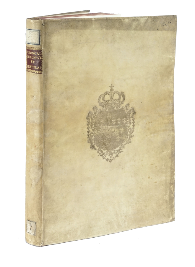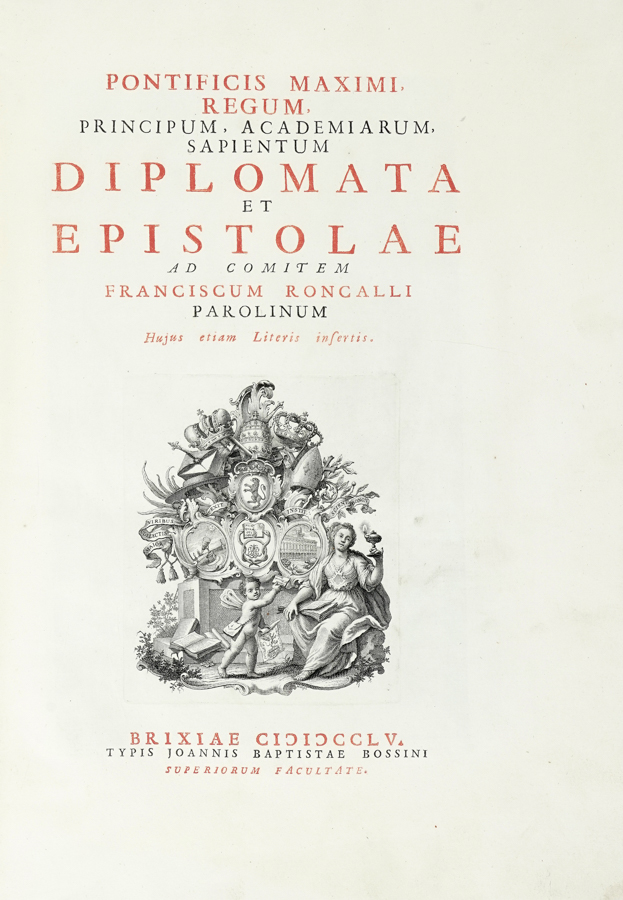 Roncalli Parolino Francesco, Pontificis maximi, regum, principum, academiarum, sapientum diplomata et epistolae... Brixiae: typis Joannis Baptistae Bossini, 1755. In folio (mm 435x300). Pagine [20], 308, [14], 2 bianche con 4 tavole a piena pagina fuori testo. Frontespizio impresso a due colori. Splendida copia, marginosa e ben conservata, frescamente impressa, con solo uno strappo restaurato alle pagine 305-306. Legatura coeva in piena pergamena rigida con titolo in oro su tassello al dorso e tagli rossi. Stemmi coronati impressi in oro al centro di ciascun piatto. Alcune tracce di polvere, buono stato complessivo. (1)
