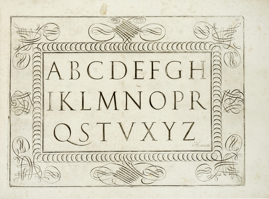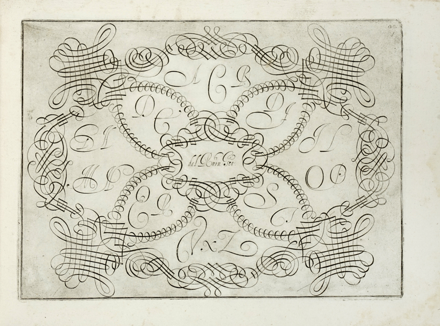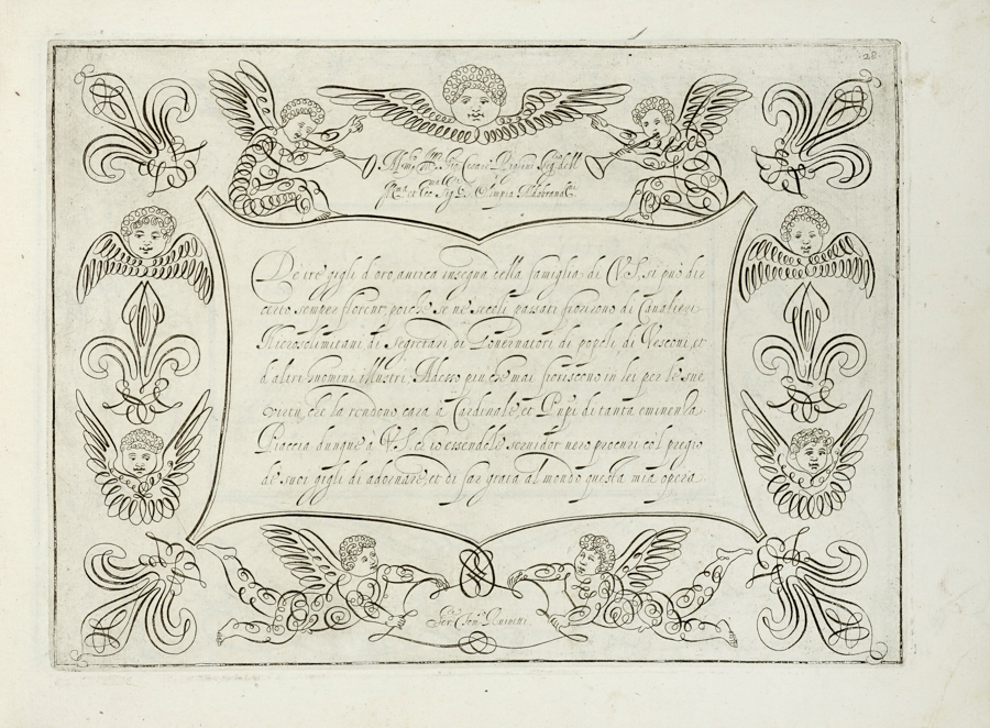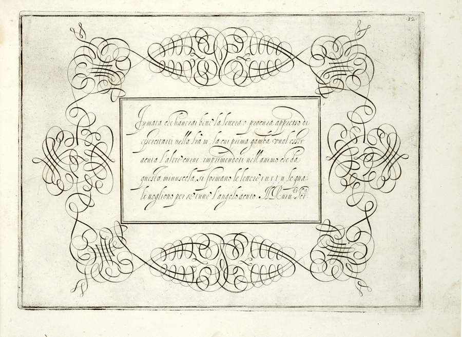 Ruinetti Tommaso, [Idea del buon scrittore]. [Roma]: 1619 ca. In folio oblungo (mm 238x330). Raccolta di 33 [di 43] tavole di esempi calligrafici. Legatura in mezza pergamena con piatti ricoperti in carta di riuso da messale antico. Si vende come raccolta di tavole, lotto non passibile di restituzione. (1)