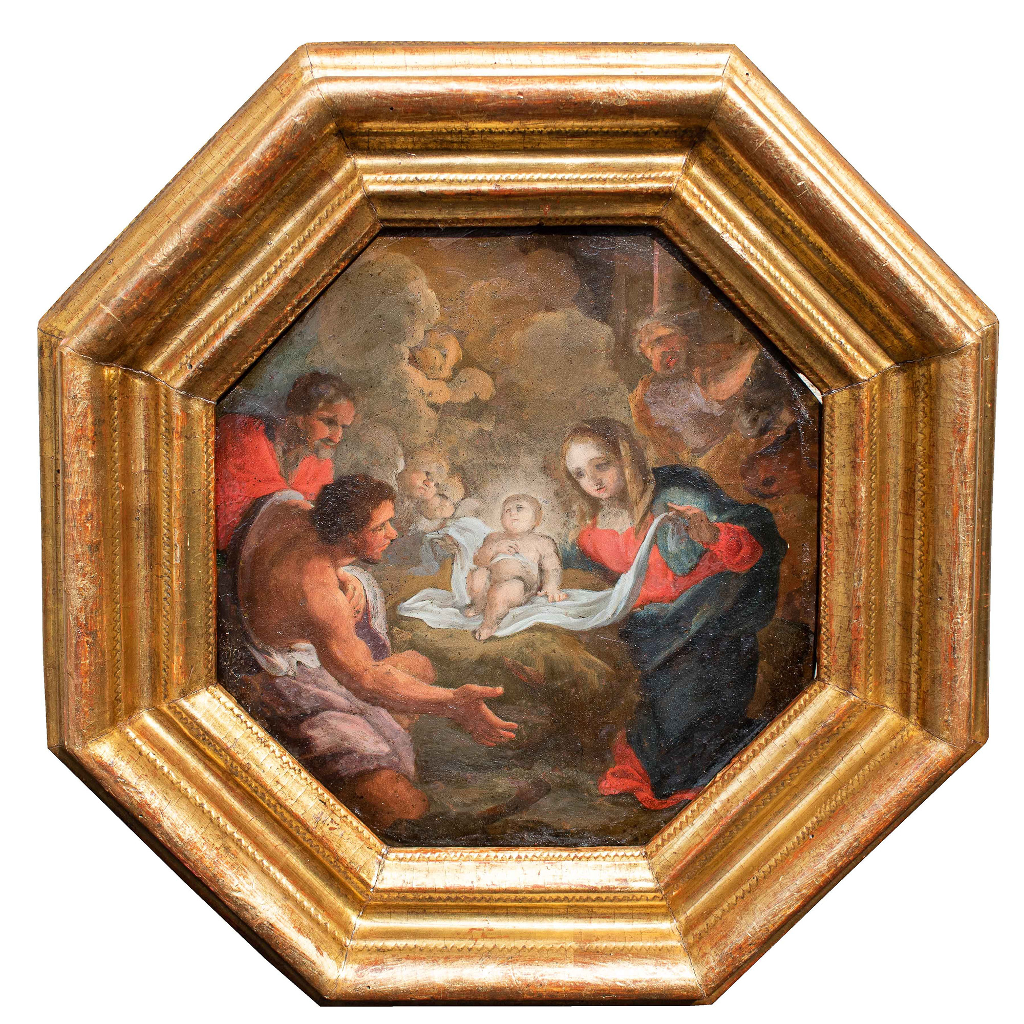 "Adorazione del bambino" olio su rame esagonale sec.XVIII