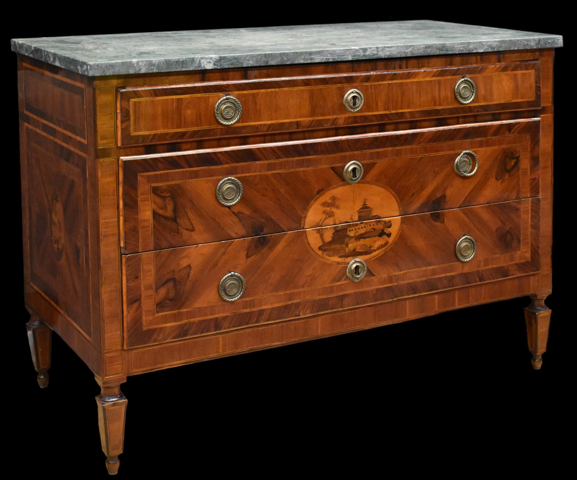 Cassettone intarsiato in legni vari , piano in marmo, epoca Luigi XV fine 700