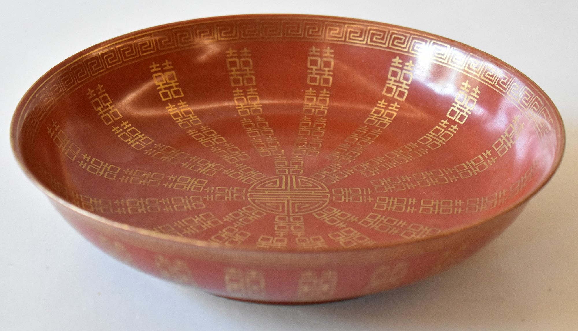 Cina piatto in porcellana, fondo color mattone, decoro in oro
