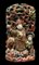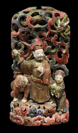 Scultura orientale in legno laccato con due personaggi e un felino