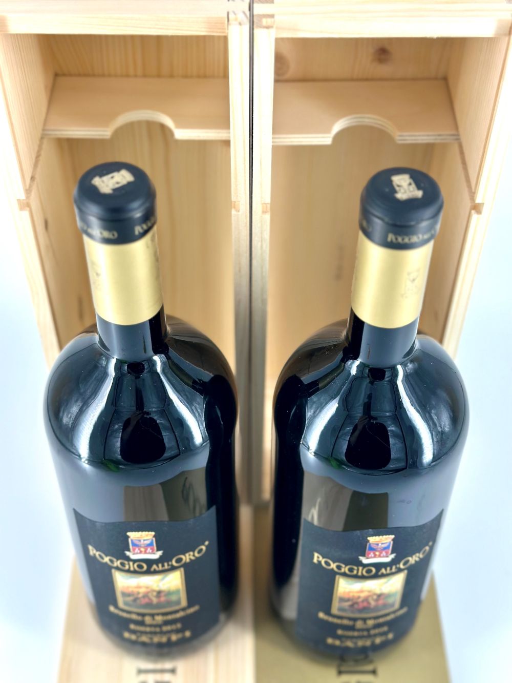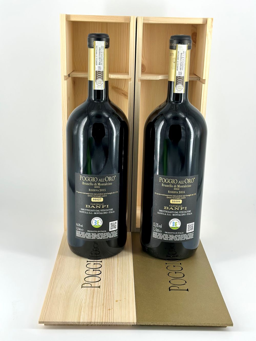 Toscana, Brunello di Montalcino DOCG - 2 Magnum (Mg), annate 2015 - 2016. Livello: entro il collo (WN), livello di colmatura standard. Confezione: scatola di legno originale (OWC). Condition report: etichetta e capsula in perfette condizioni.
