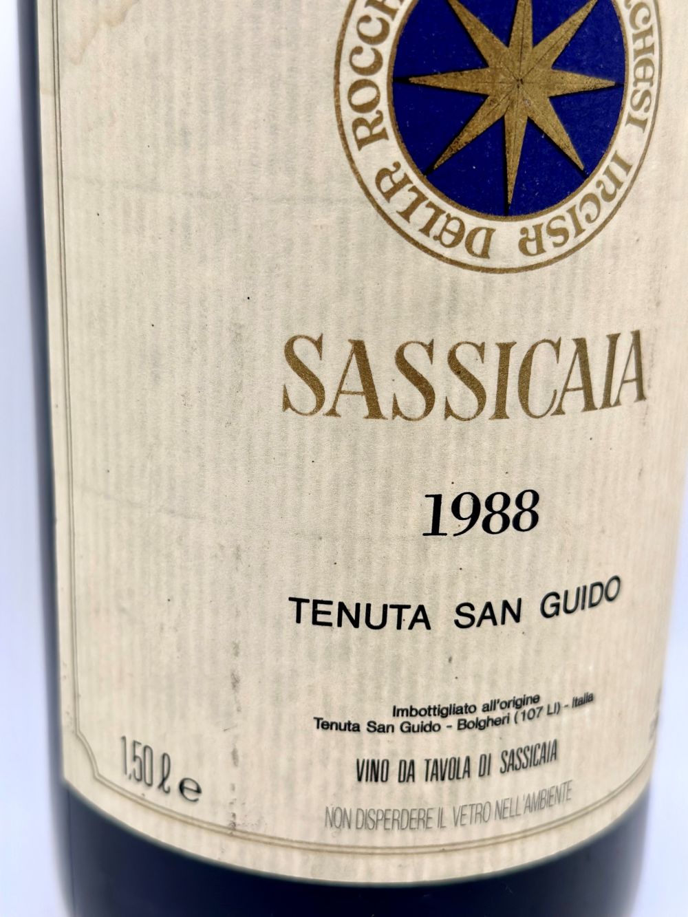Toscana, Sassicaia DOC - 1 Magnum (Mg), annata 1988. Livello: spalla (S), livello normale per i vini fra i 10 e i 15 anni d'età. Condition report: etichetta e capsula leggermente danneggiate.