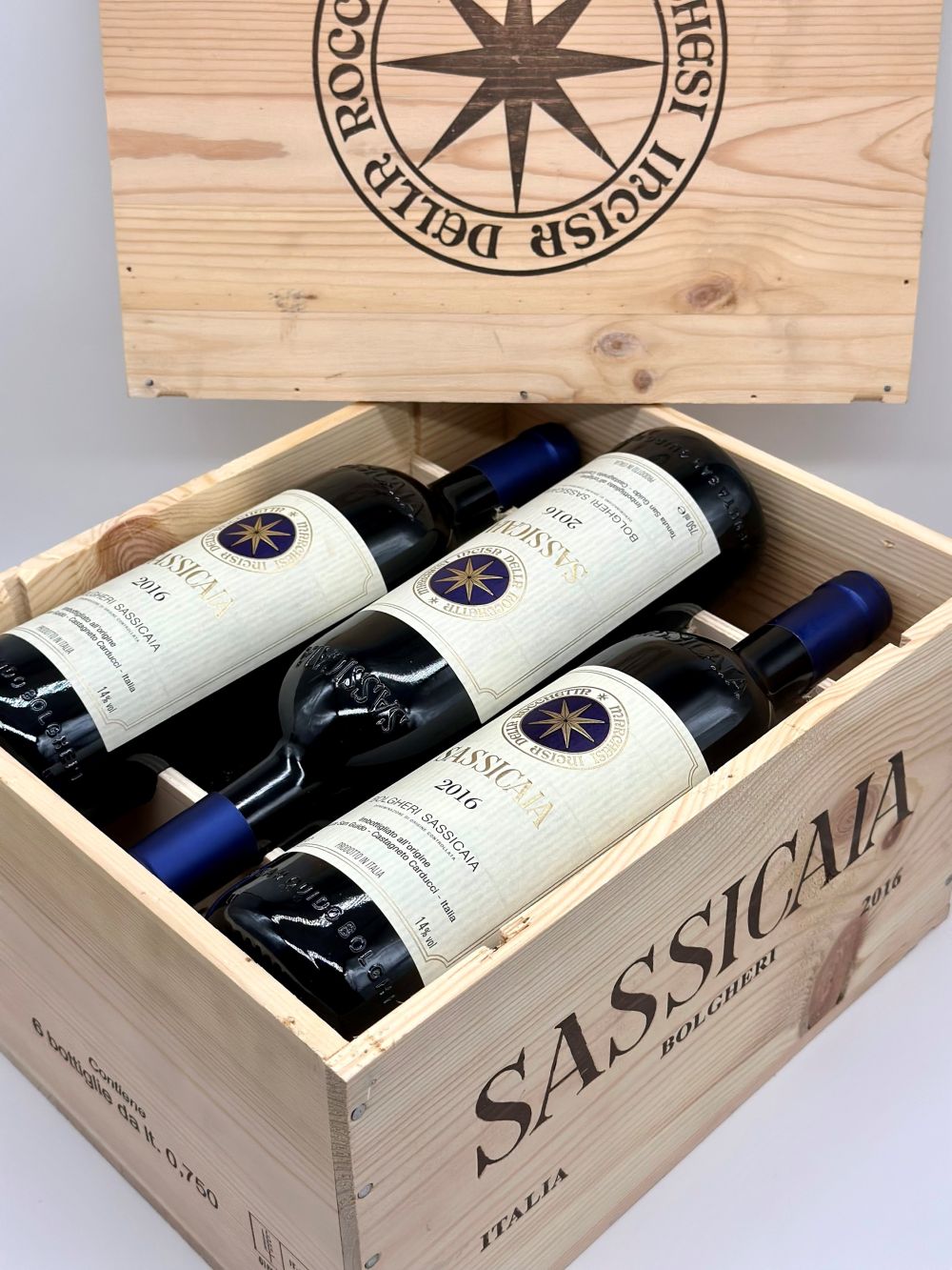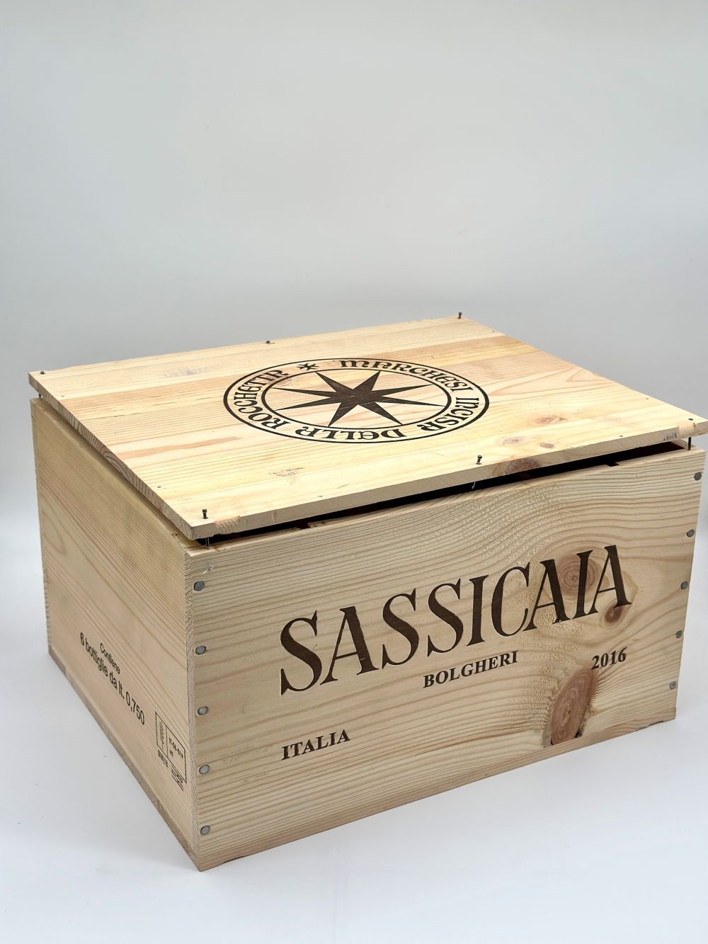 Toscana, Sassicaia DOC - 6 bottiglie (bt), annata 2016. Livello: entro il collo (WN), livello di colmatura standard. Confezione: scatola di legno originale (OWC). Condition report: etichetta e capsula in perfette condizioni.