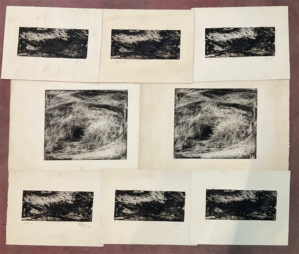 Lotto di otto incisioni su carta, tutte firmate, di cui sette datate 1958 (sei fogli cm 25x32,5, lastra cm 10x23,5; due fogli cm 32,5x50, lastra cm 24x28)