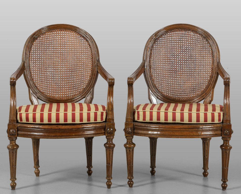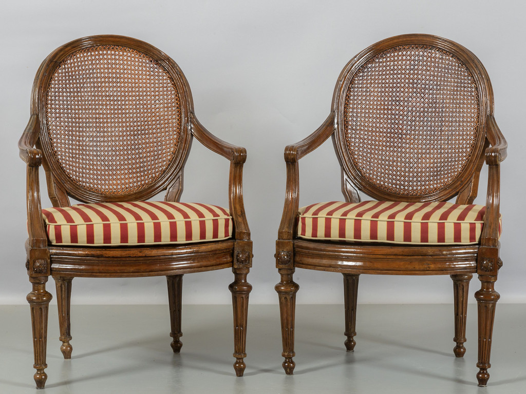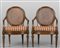 Due poltrone Luigi XVI ovaline in noce Genova II metà sec.XVIII