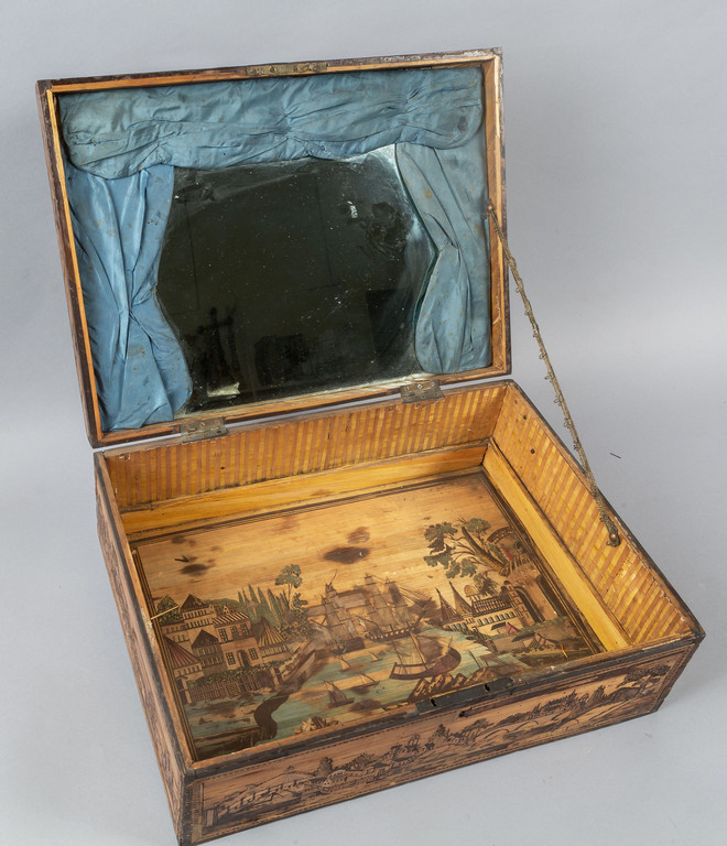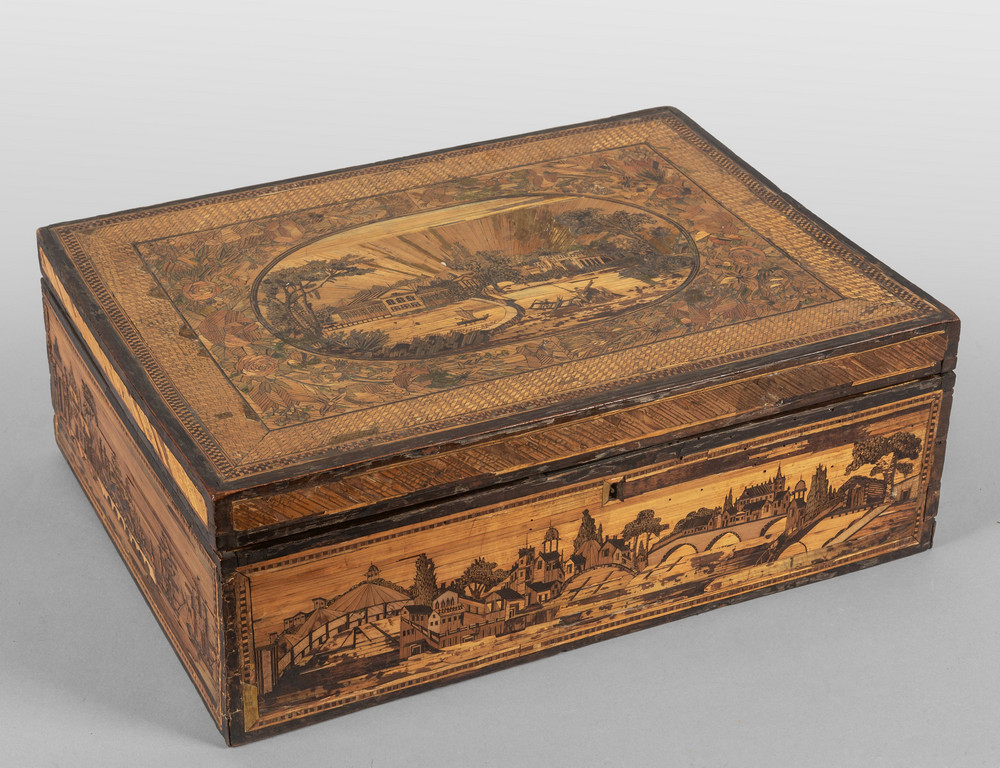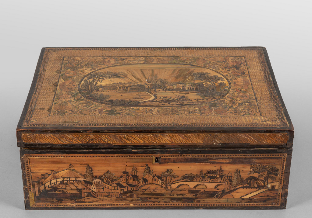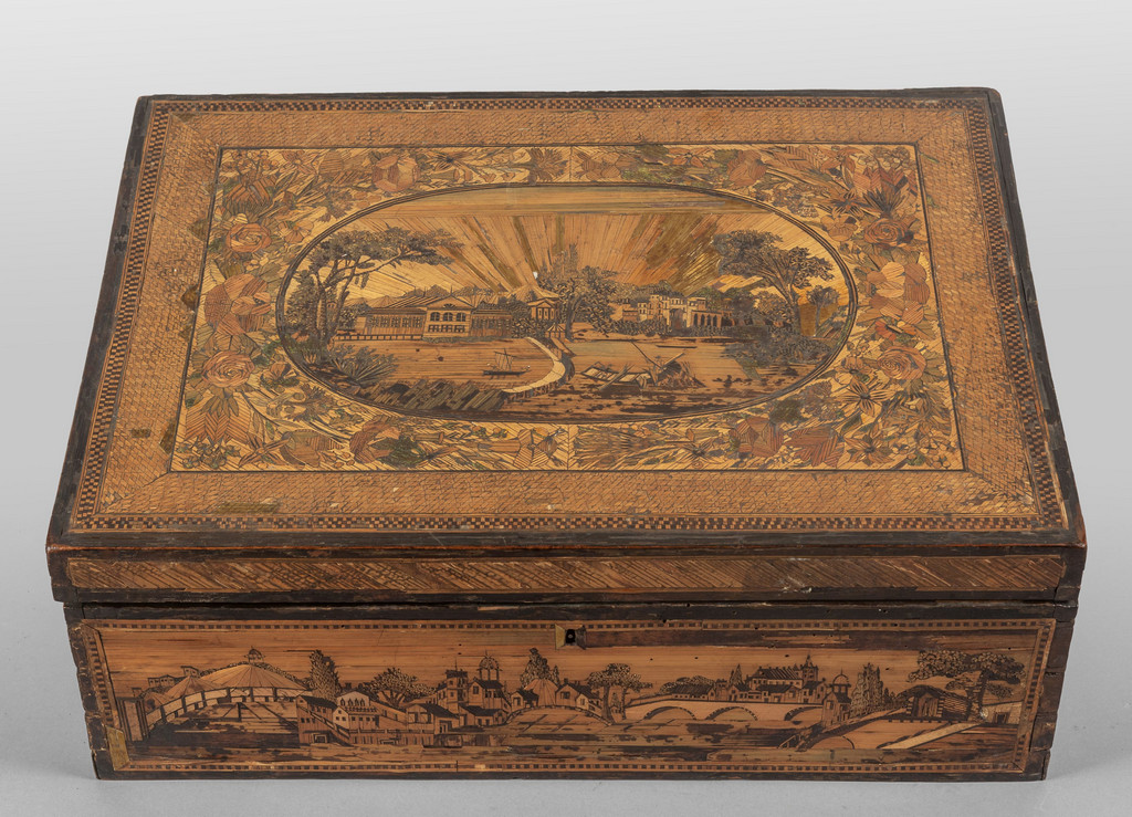 Scatola in paglia decorata a paesaggi anche all'interno sec. XIX