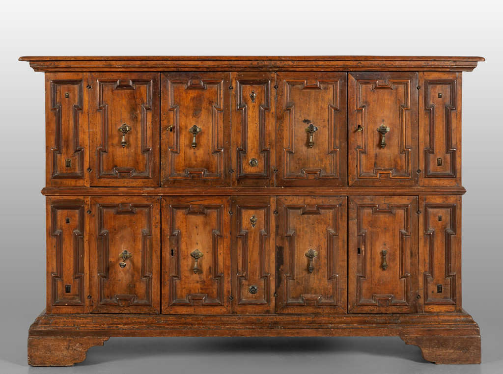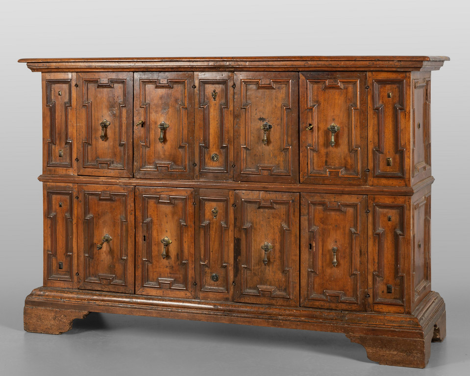 Credenza Luigi XIV ad otto sportelli in noce intagliati a motivi geometrici Italia del Nord sec.XVII