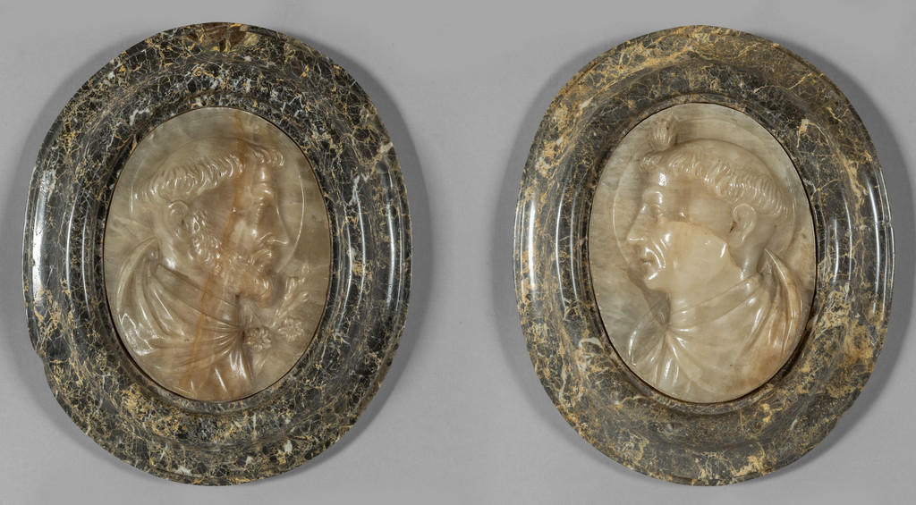 Profili di Santi coppia di altorilievi in onice f.ti nel retro Bonazza cornici in marmo Venezia inizi sec.XVIII
