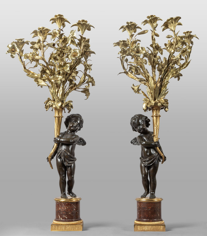 Coppia di torcere in bronzo brunito e dorato raffiguranti putti che sorreggono una cornucopia Francia sec.XIX