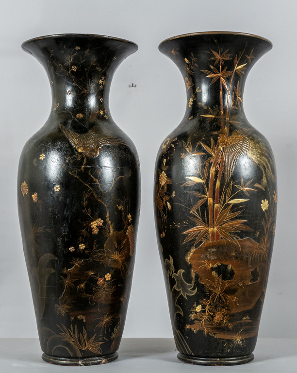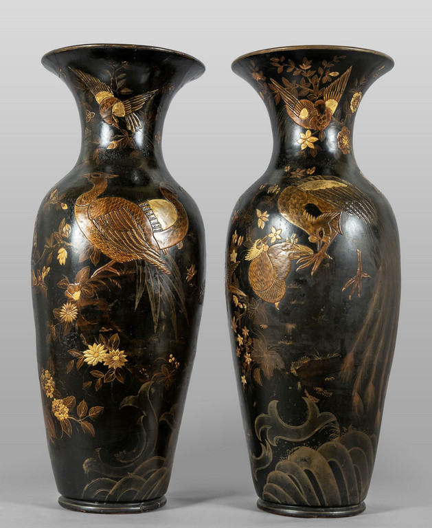 Coppia di vasi in terracotta dipinta a fondo nero con decorazioni in oro Berlino sec.XIX