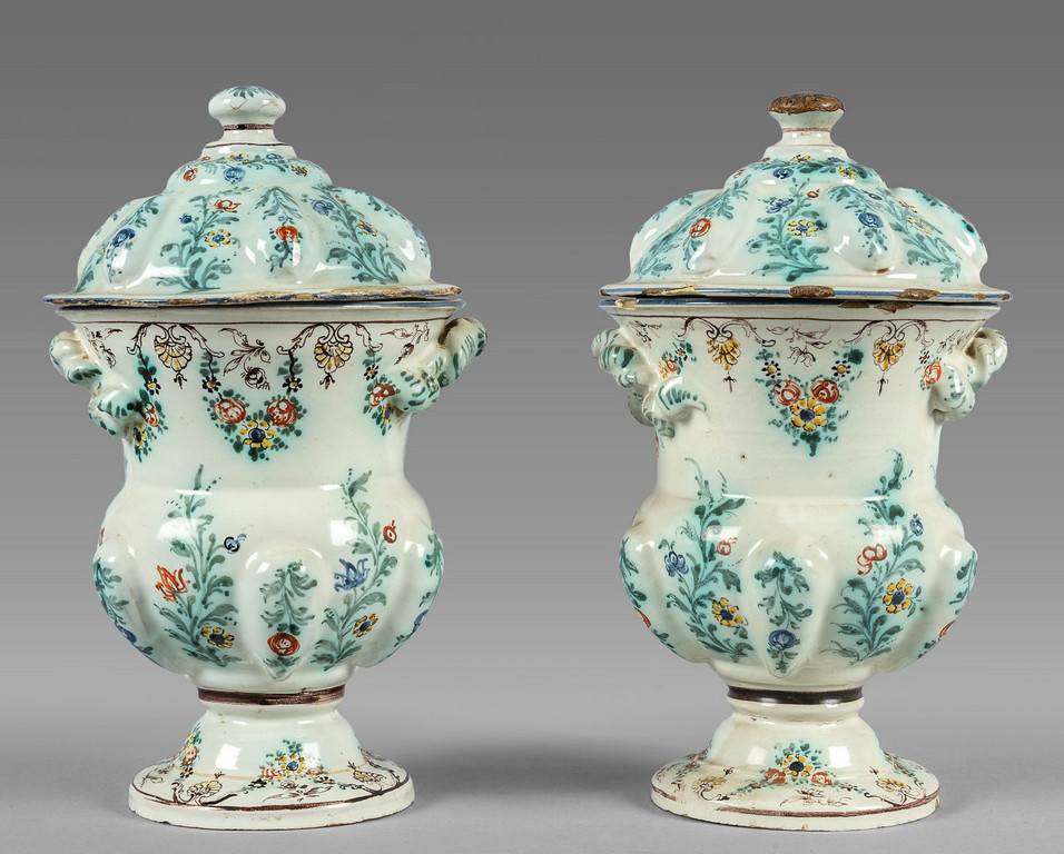 Coppia di vasi in maiolica policroma a decoro florerale marcati alla base BL con globo crucifero Savona sec.XVIII