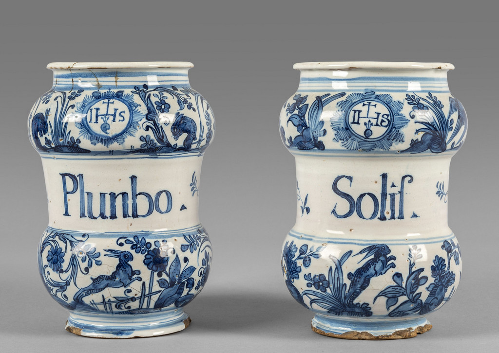 Coppia di albarelli in ceramica bianca e blu a decoro naturalistico marca Corona Savona fine sec.XVII