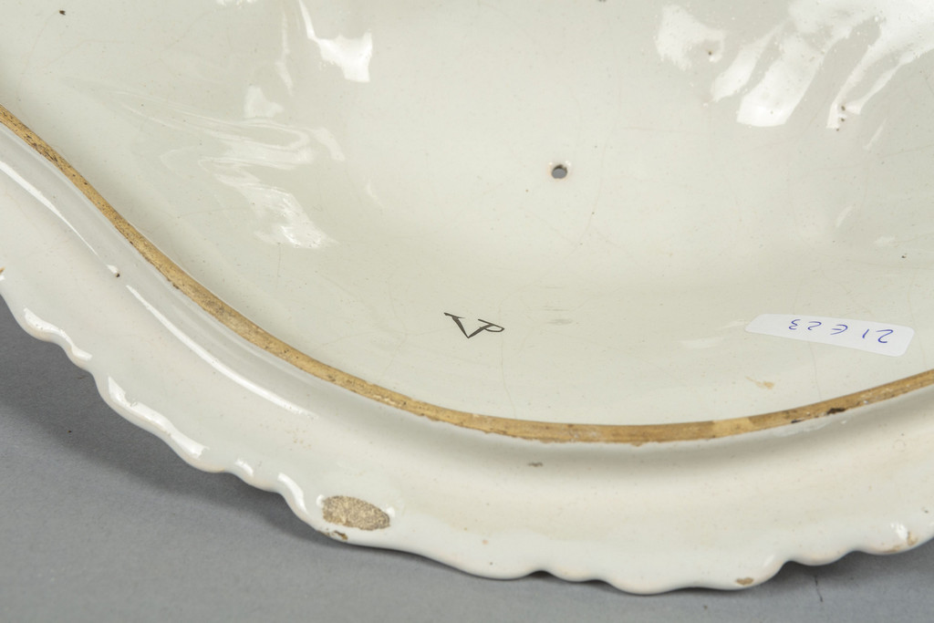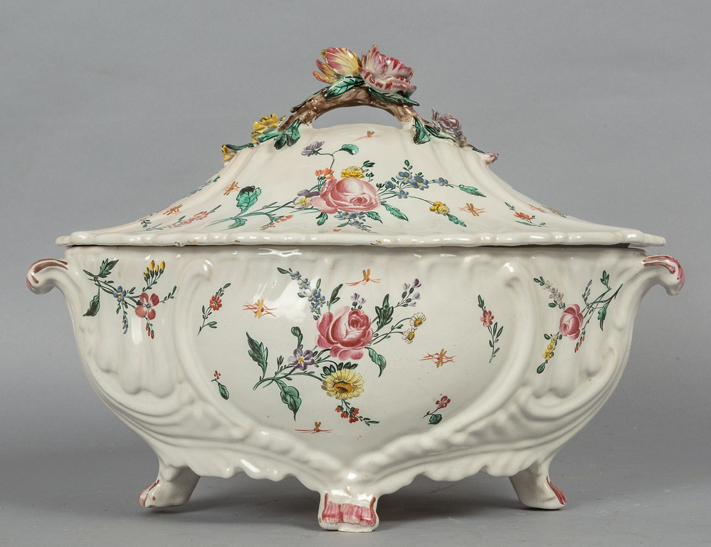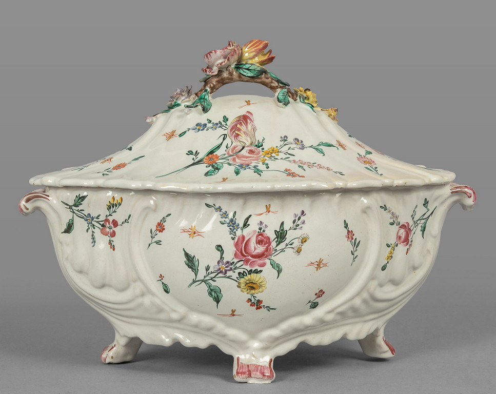 Zuppiera in maiolica policroma decorata a fiori ed insetti manifattura Veuve Perrin Marsiglia metà sec.XVIII (marcata) nel fondo etichetta Antichità Questa Torino
