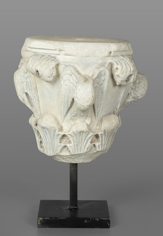 Capitello medioevale di epoca federiciana in pietra scolpita con aquile e foglie