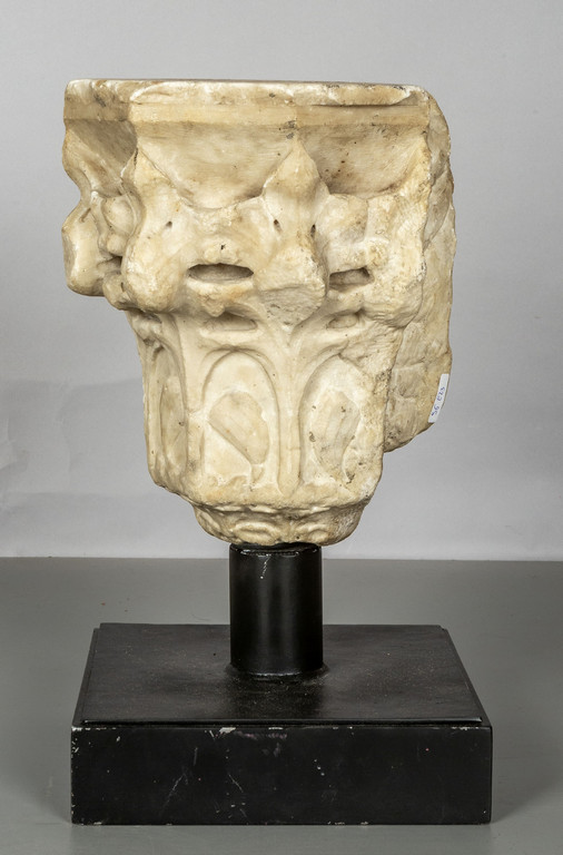 Capitello medioevale di epoca federiciana in marmo scolpito a quartieri con decorazione a conchiglie e aquile