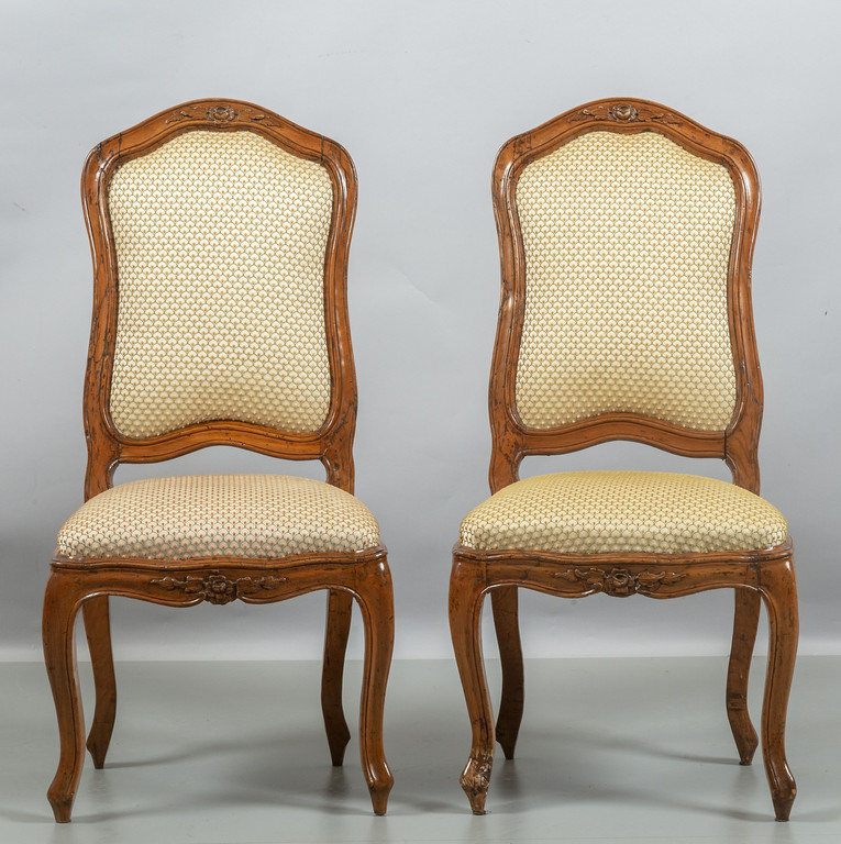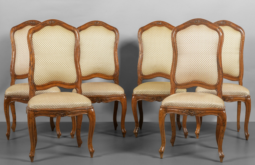 Sei sedie Luigi XV in noce intagliato con roselline nello schienale e nella seduta Genova I metà sec.XVIII