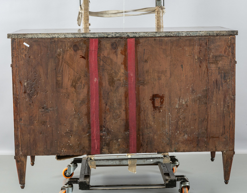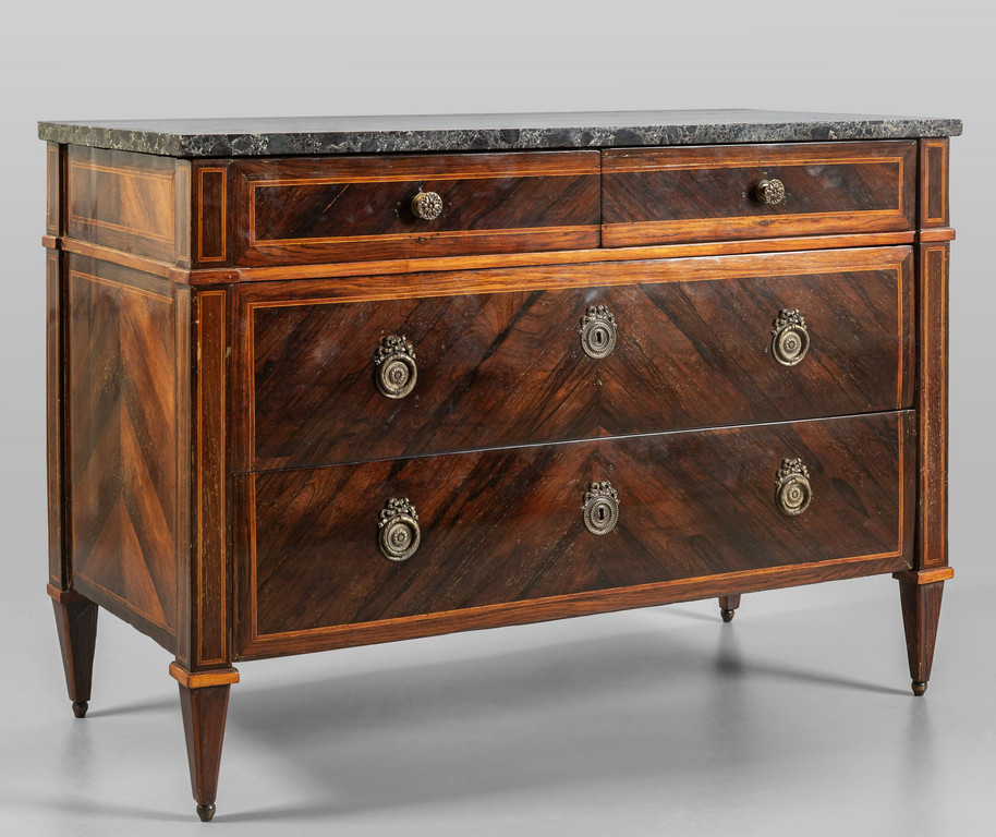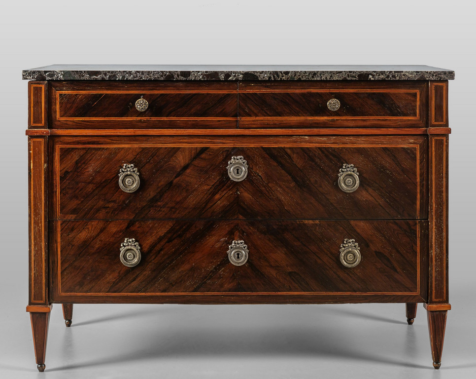 Comò Luigi XVI a due cassetti più due lastronato in palissandro e filettato in bois de rose piano in marmo Genova sec.XVIII