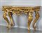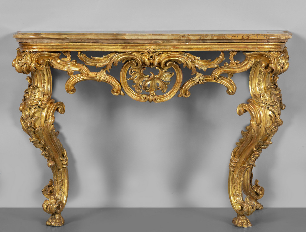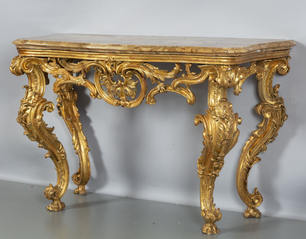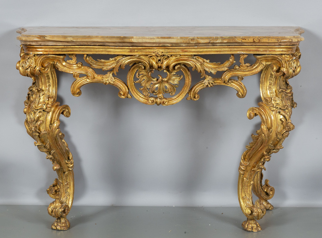 Console Luigi XV in legno finemente intagliato e dorato piano in onice fiorito Genova metà sec. XVIII
