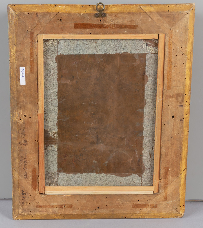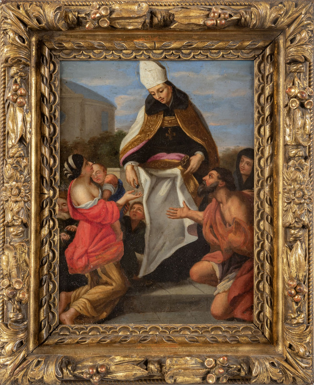 Scuola lombarda sec.XVII 'Santo benedicente' olio su rame cornice antica in legno intagliato e dorato