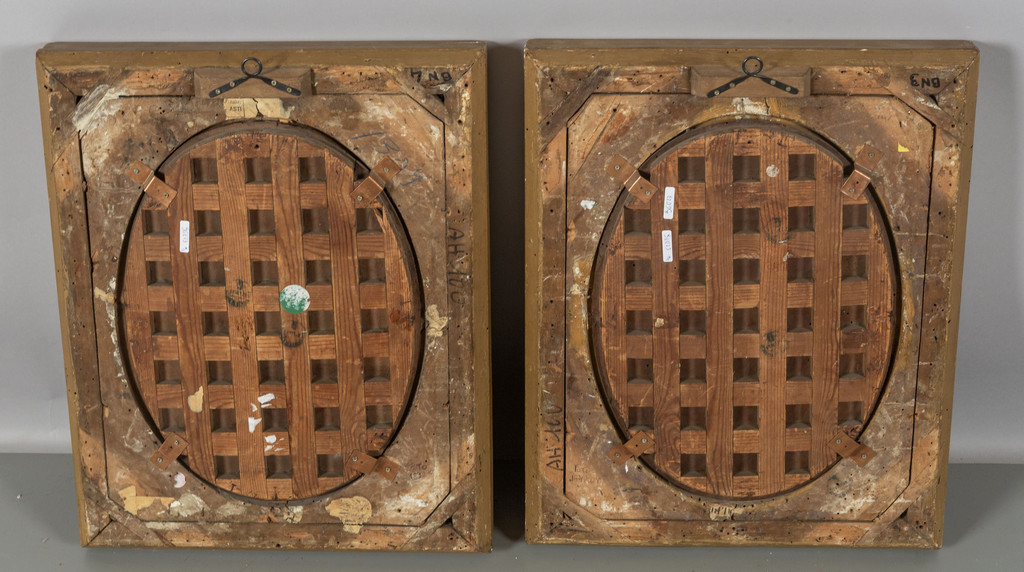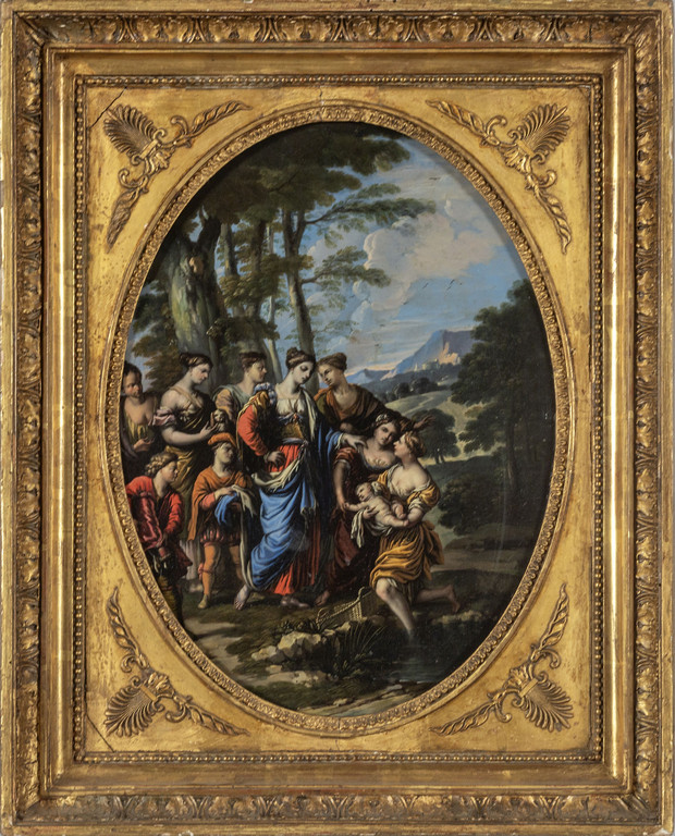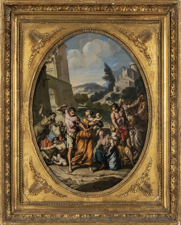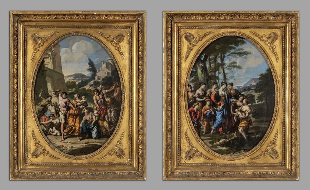 Scuola bolognese inizi sec.XVII 'Mosè salvato dalle acque' e 'Strage degli innocenti' coppia di olii ovali