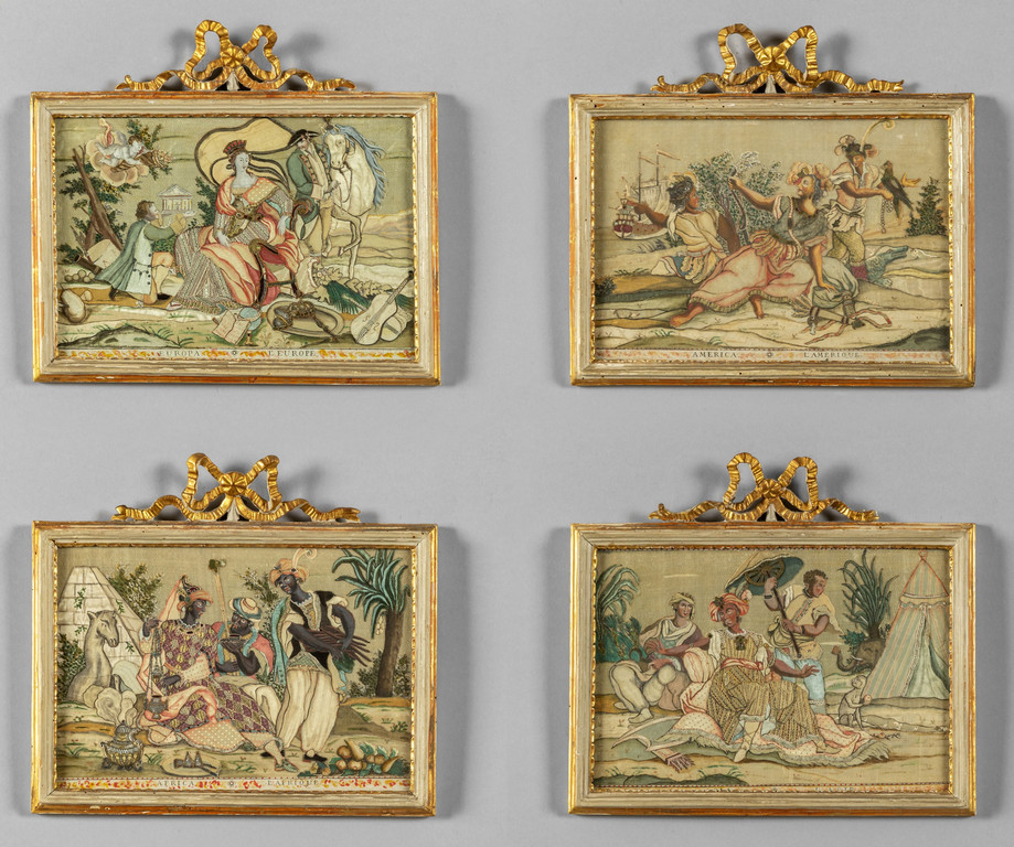 I continenti quattro ricami policromi in cornici coeve in legno intagliato laccato e dorato sec.XVIII