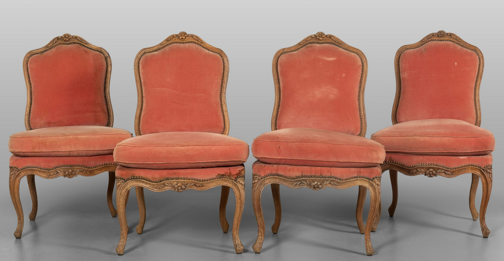 Quattro sedie Luigi XV in noce schienale intagliato con roselline sec.XVIII
