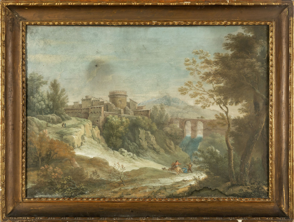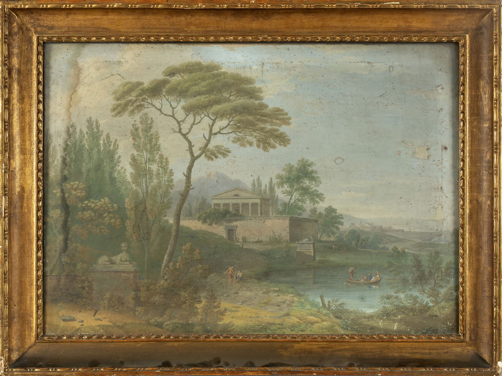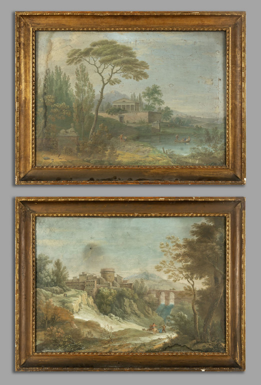 Scuola veneta fine sec.XIX 'Paesaggi con fiume e architetture animati da personaggi' coppia di tempere