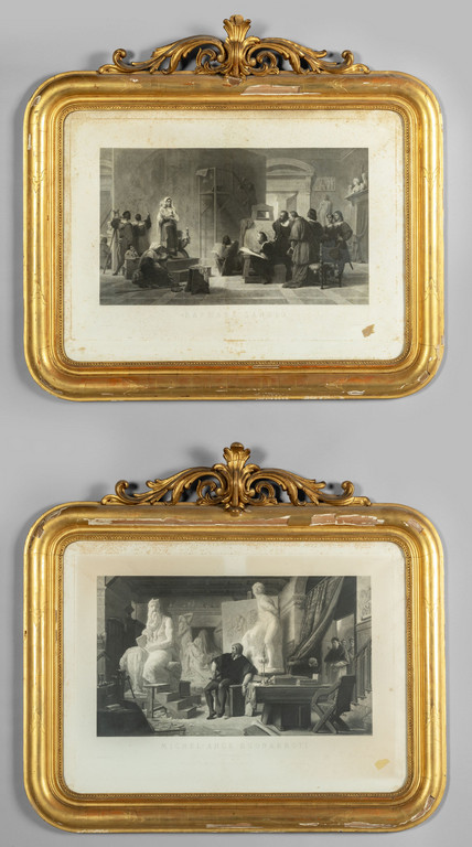 Coppia di incisioni raffiguranti Raffaello e Michelangelo cornici a vassoio in legno intagliato e dorato sec.XIX