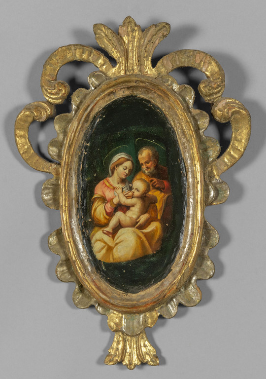Cornicetta in legno intagliato e dorato con all'interno dipinto raffigurante Sacra Famiglia sec.XIX