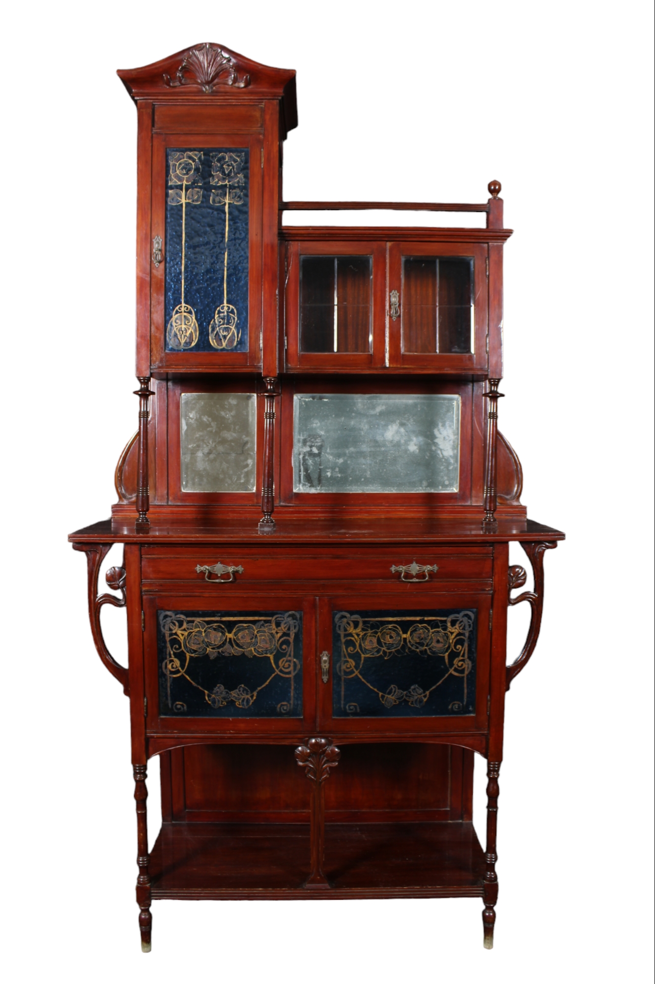 MOBILE DOPPIO CORPO in mogano con vetri dipinti a motivi floreali periodo Liberty Sicilia h cm 230 x 118 x 42
