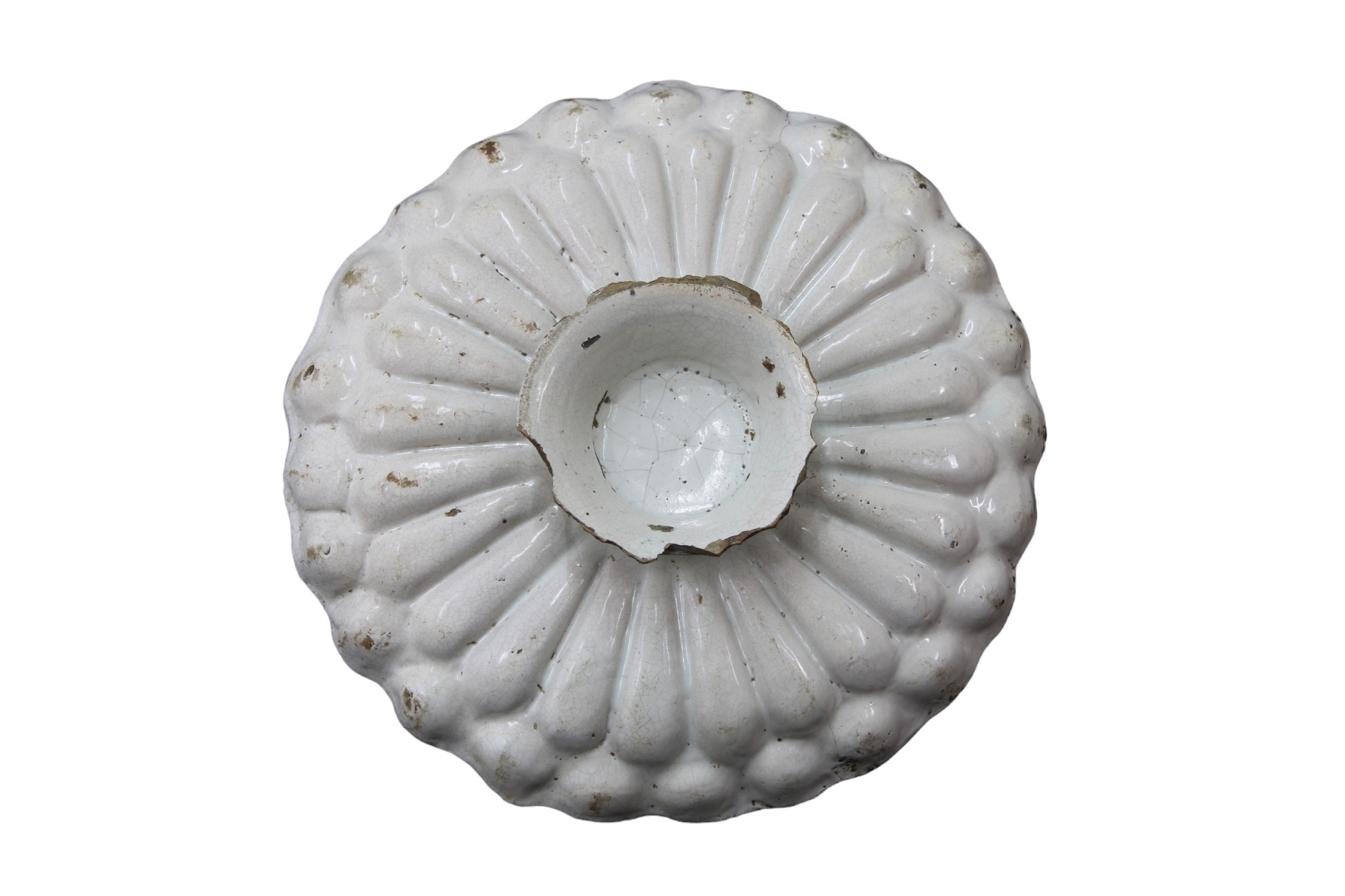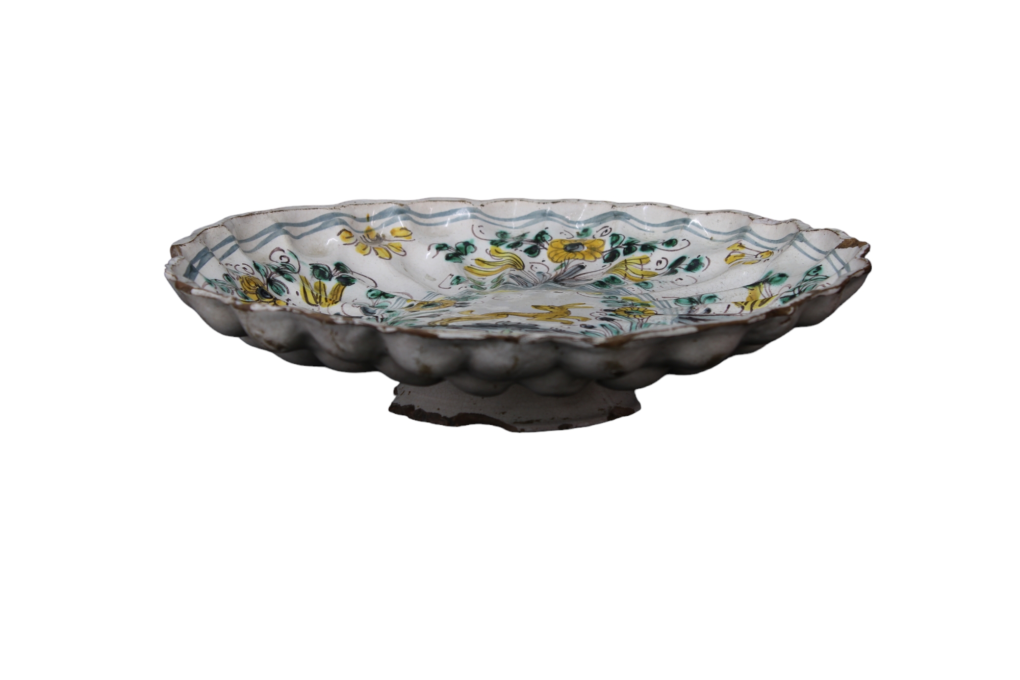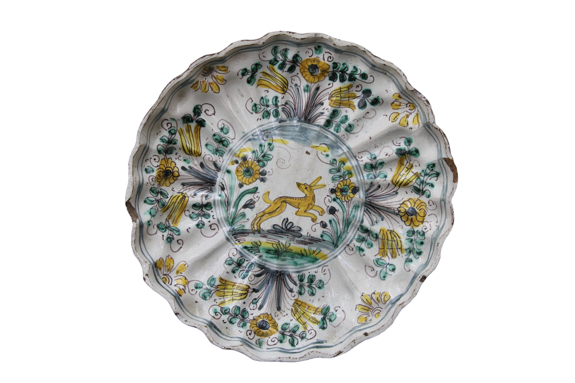 CRESPINA in maiolica policroma dipinta a motivi floreali e animali dentro riserva, usure del tempo, sbeccature alla base manifattura Ariano Irpino XVIII secolo h cm 6,5 x Ø 29,5