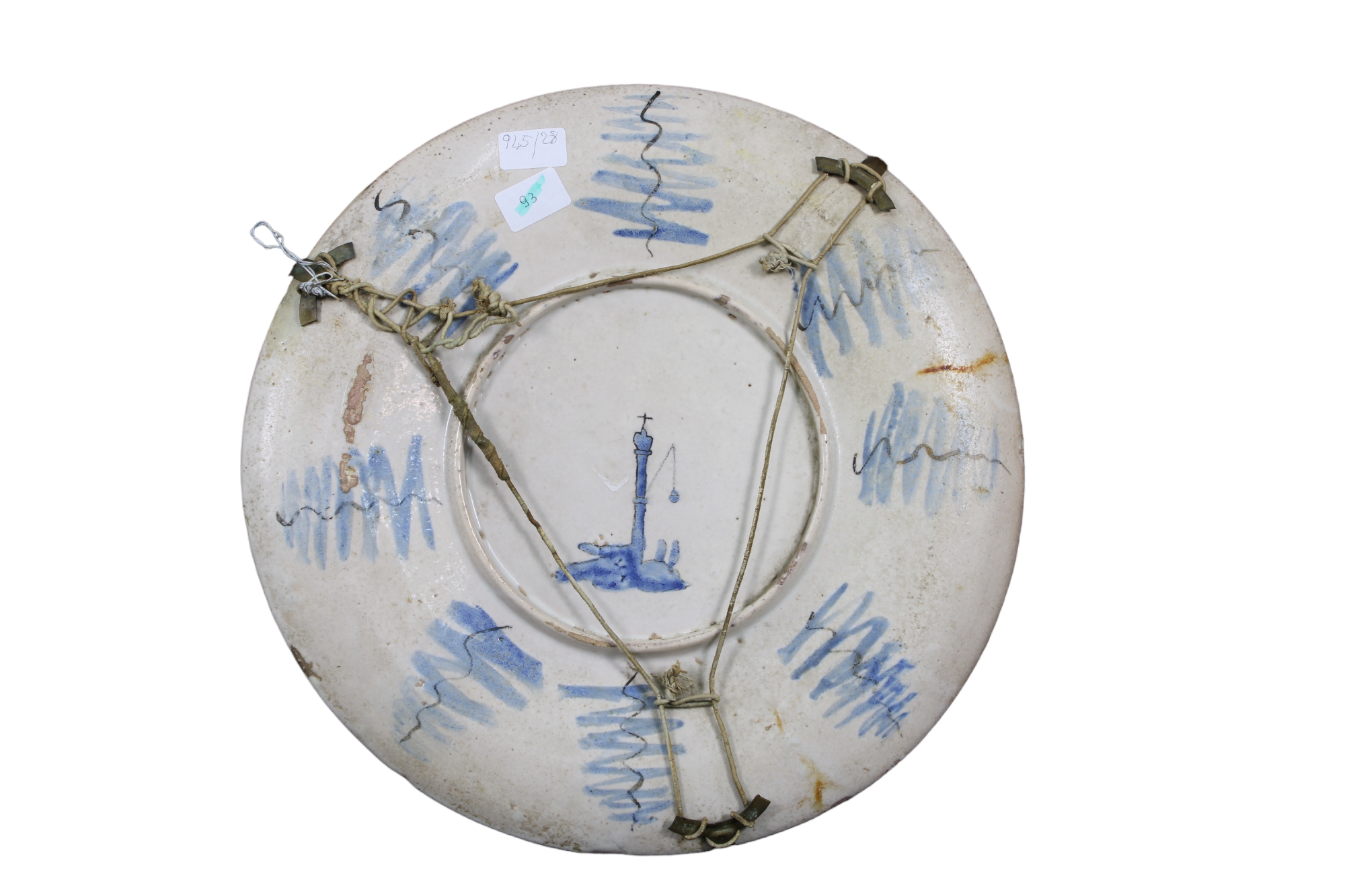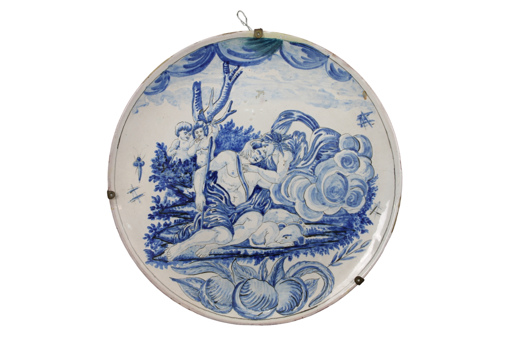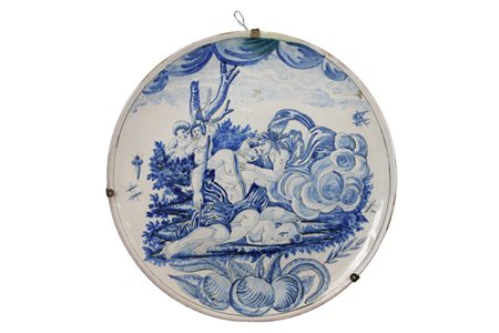 PIATTO ISTORIATO in maiolica raffigurante scena mitologica, sul retro reca marchio Torretta, piccolo vecchio restauro sul bordo maestranze Ligure XVIII secolo cm Ø 32