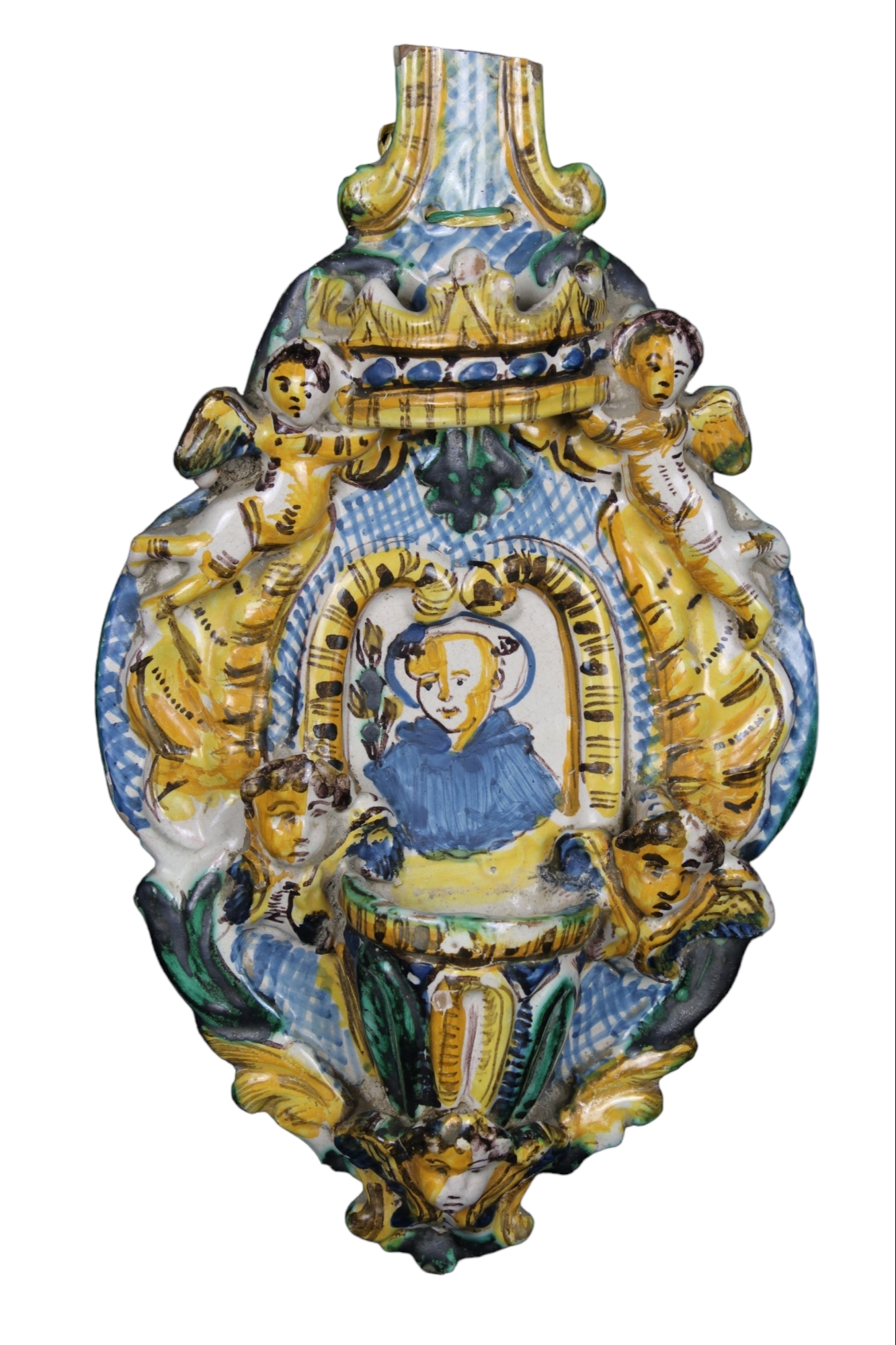 ACQUASANTIERA in maiolica policroma, sul fronte raffigura San Francesco con angeli e cherubini, mancanze Ariano Irpino XVIII secolo h cm 37 x 21,5 x 7